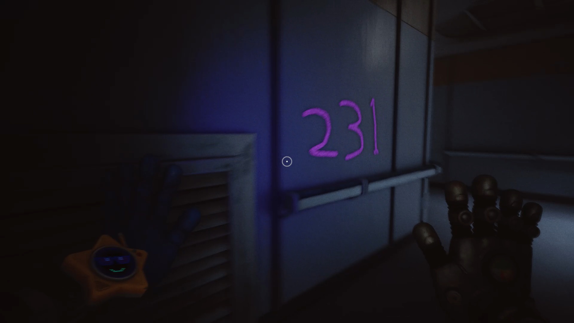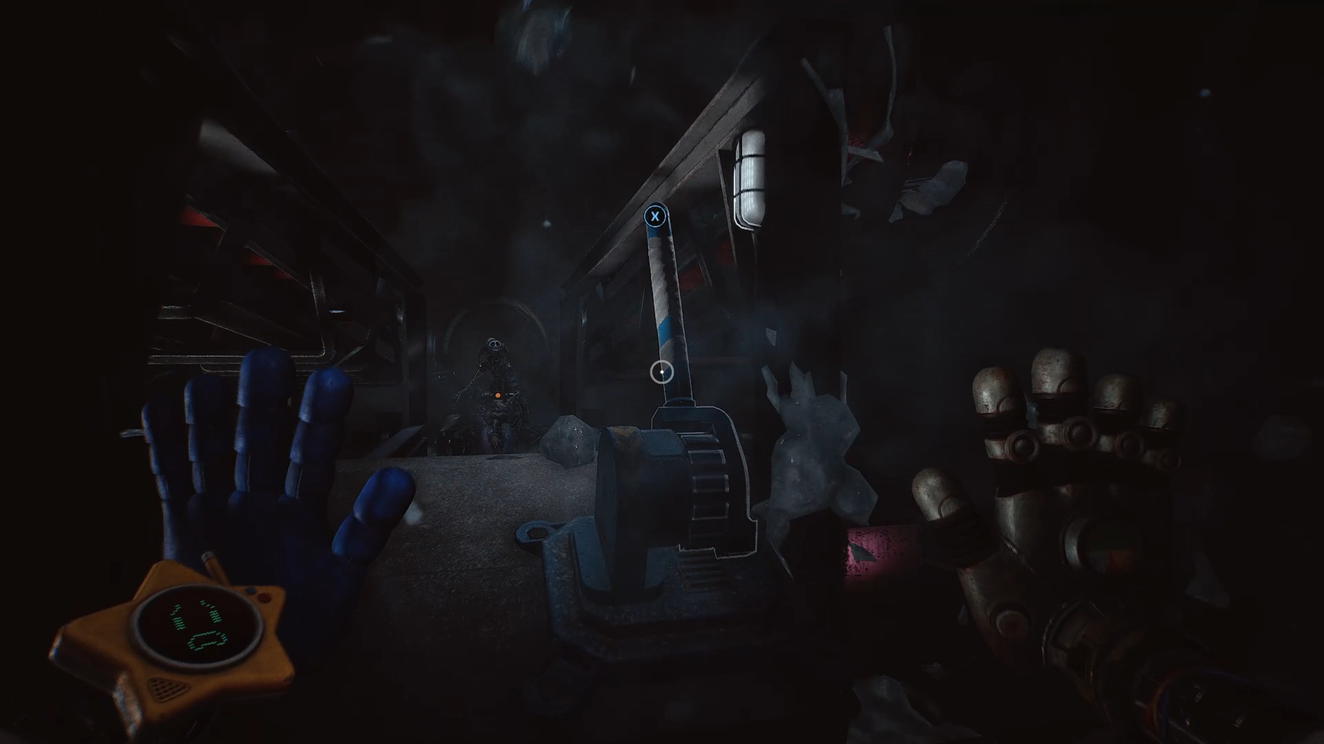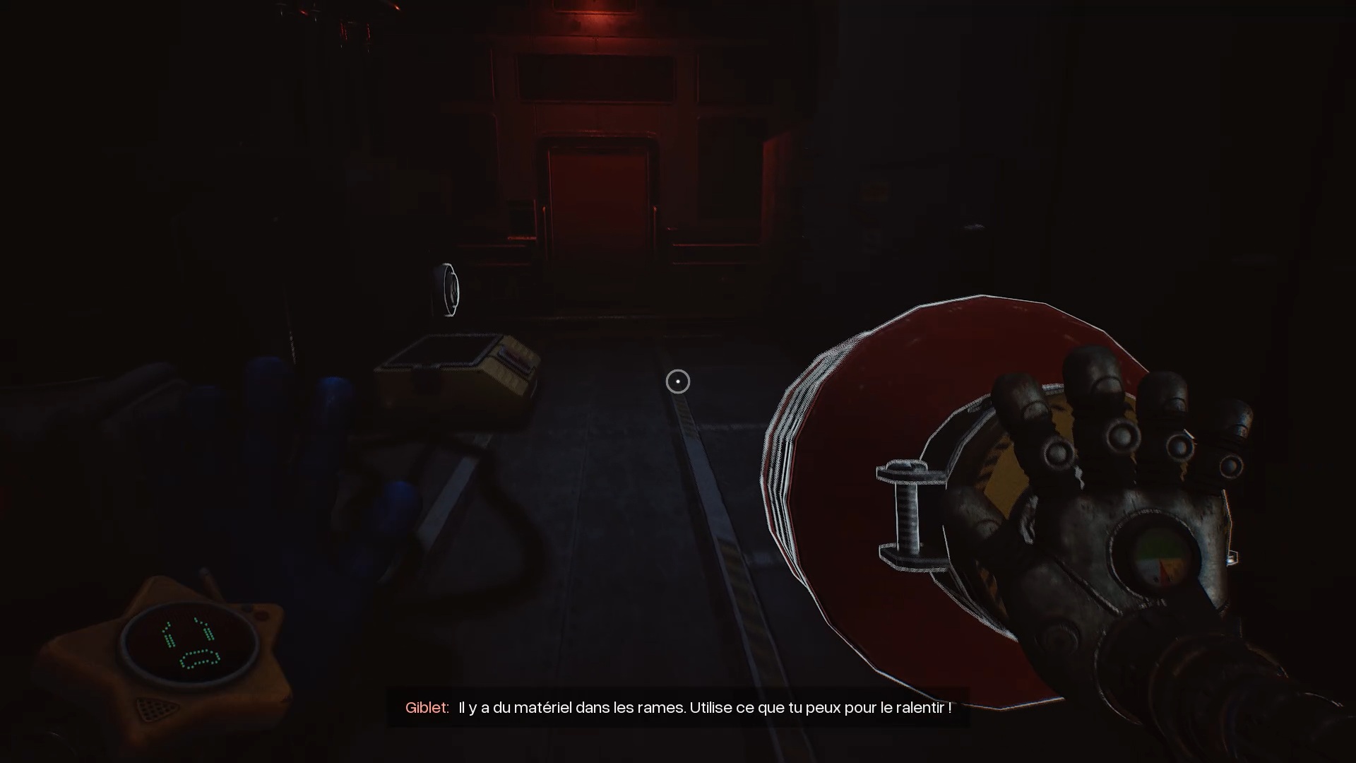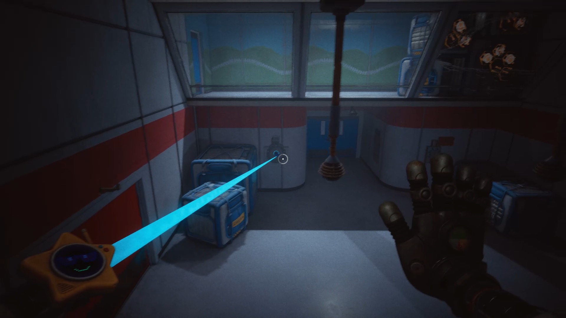 À la réception, franchissez la porte bleue, puis traversez plusieurs portes jusqu’à atteindre une vitre à moitié brisée. Utilisez votre main à pression pour passer au travers. Une nouvelle tâche vous est alors confiée : rétablir le courant.