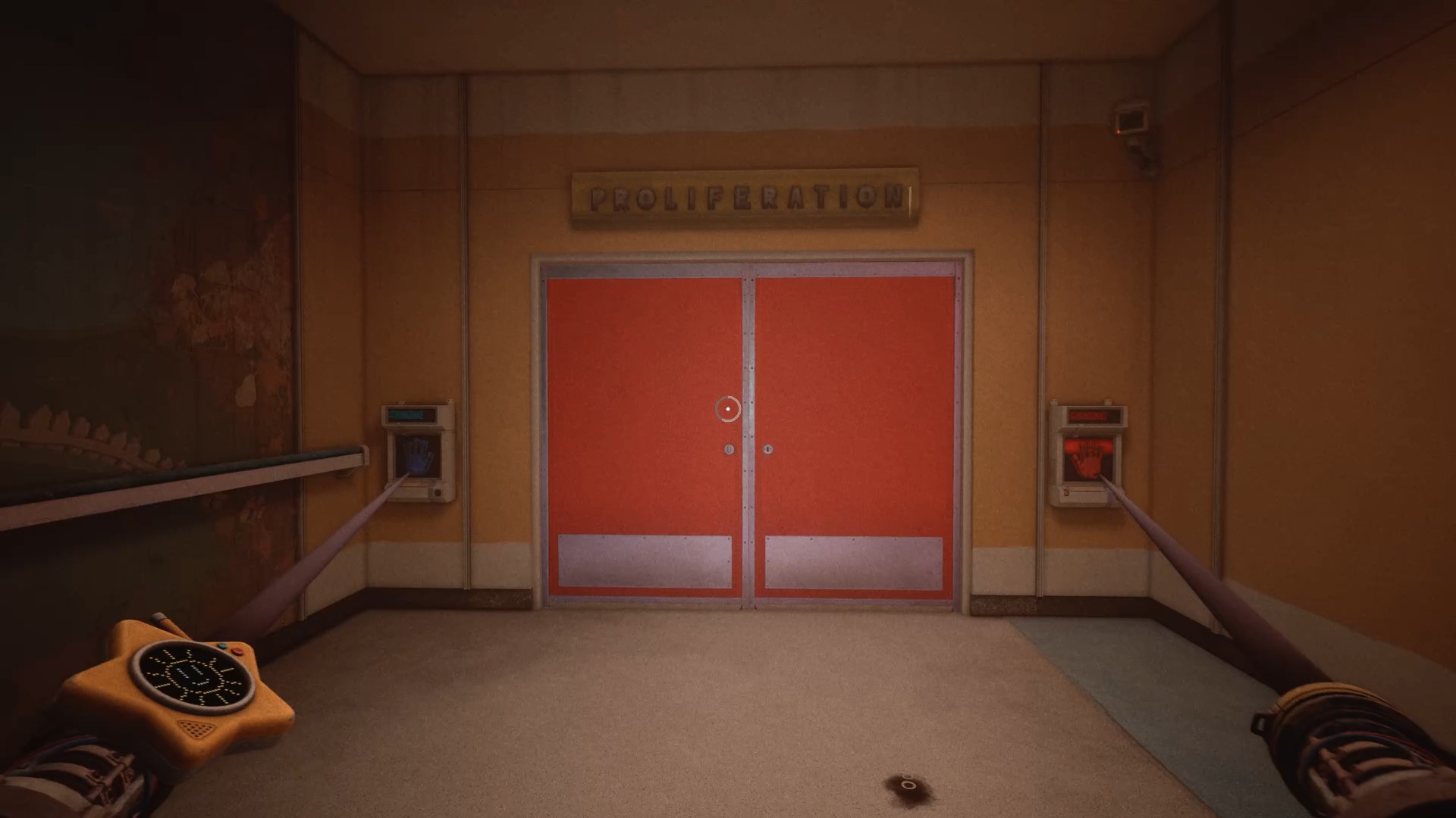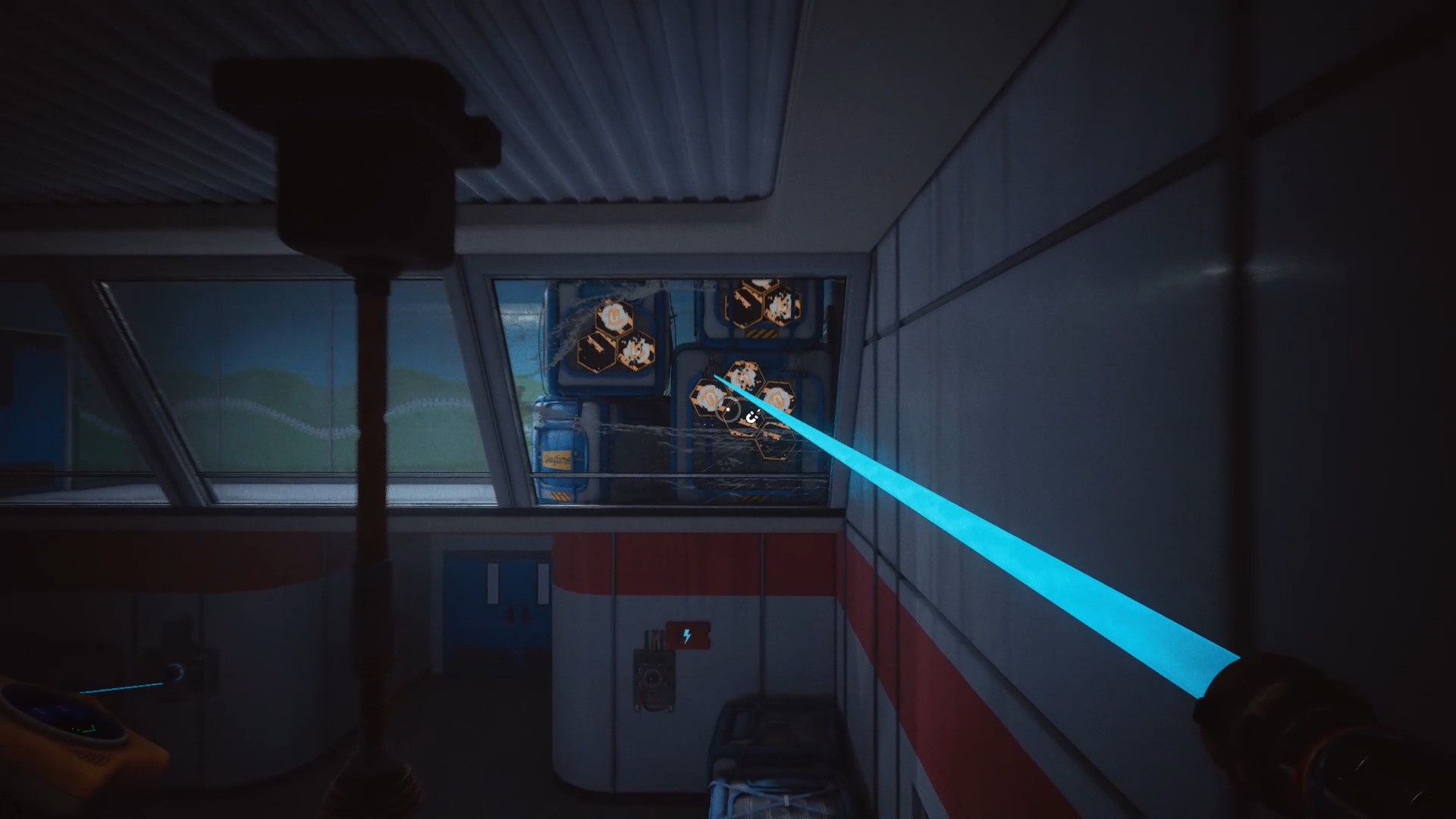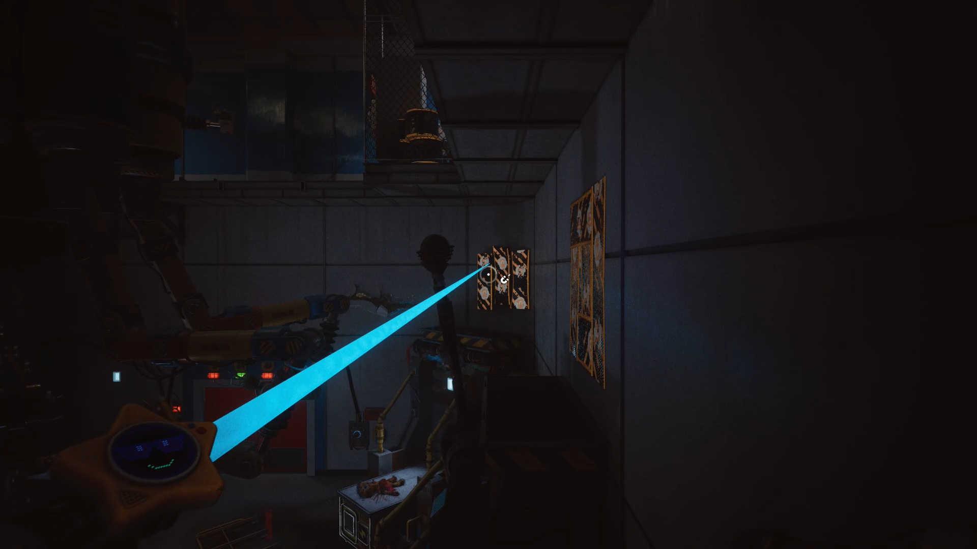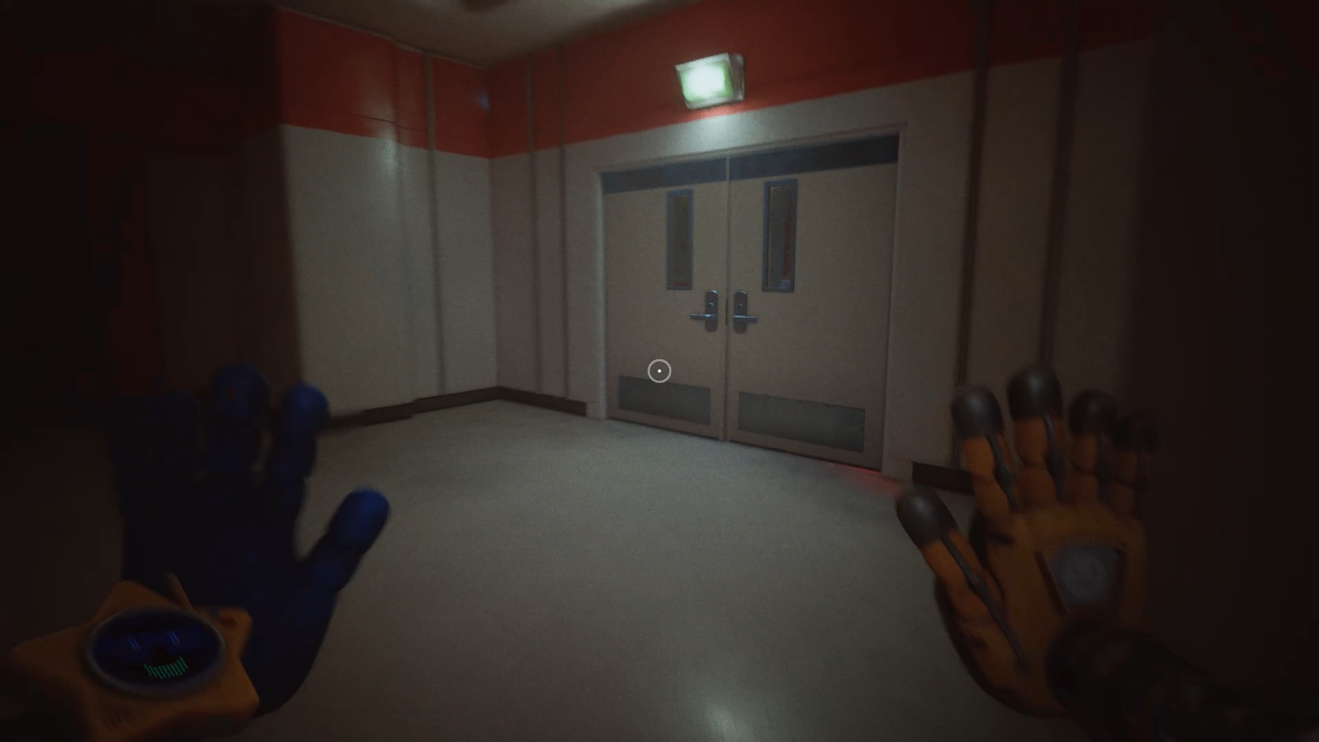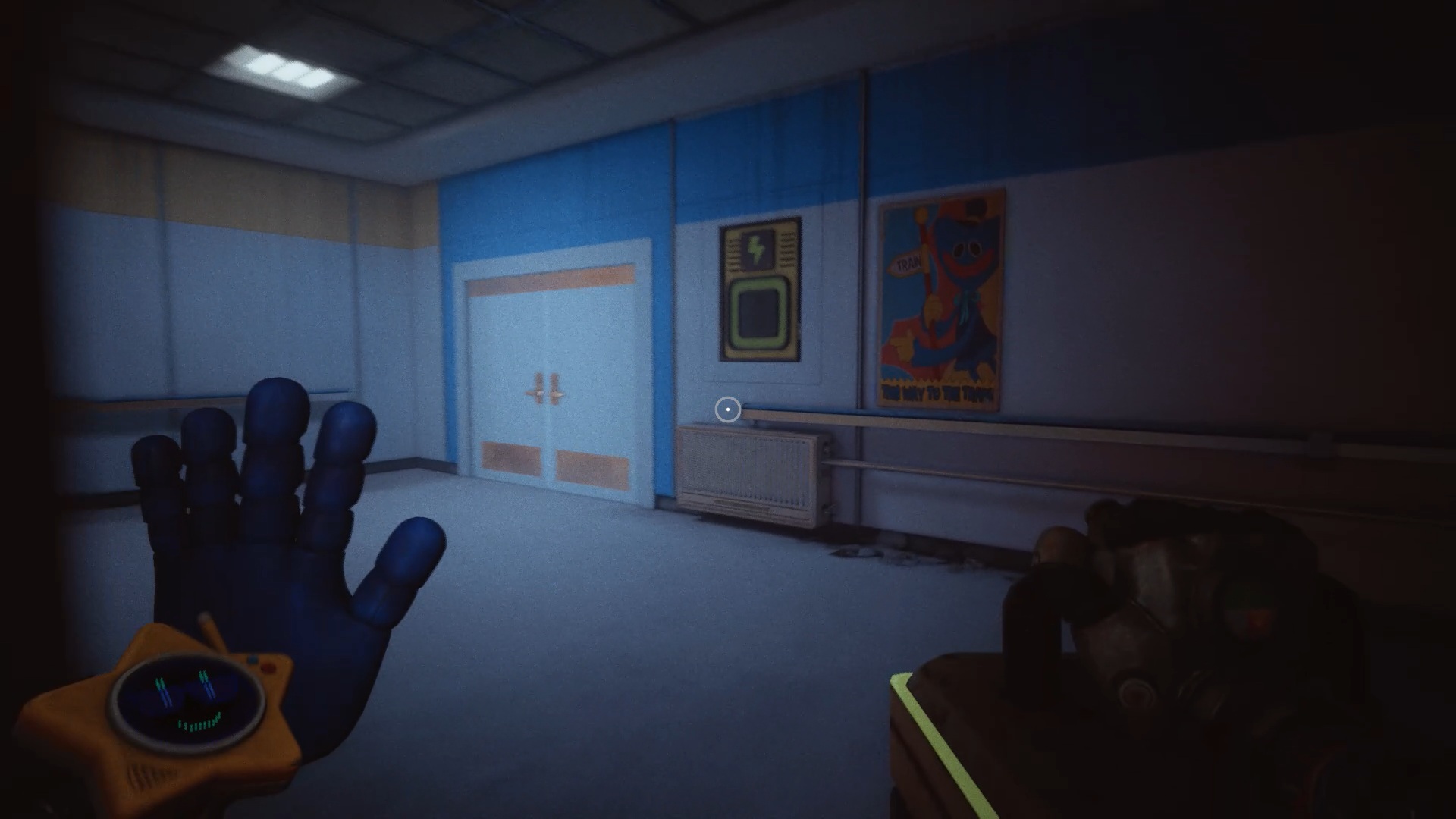 À la réception, franchissez la porte bleue, puis traversez plusieurs portes jusqu’à atteindre une vitre à moitié brisée. Utilisez votre main à pression pour passer au travers. Une nouvelle tâche vous est alors confiée : rétablir le courant.