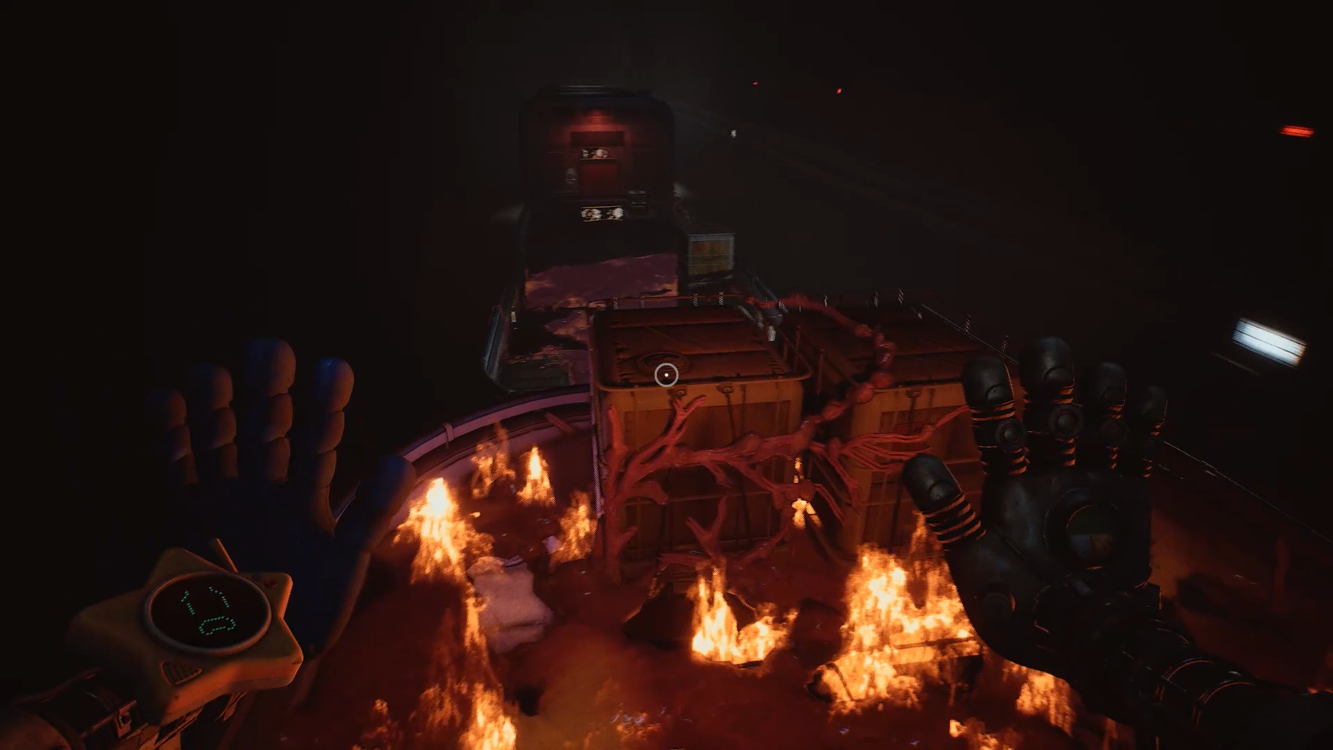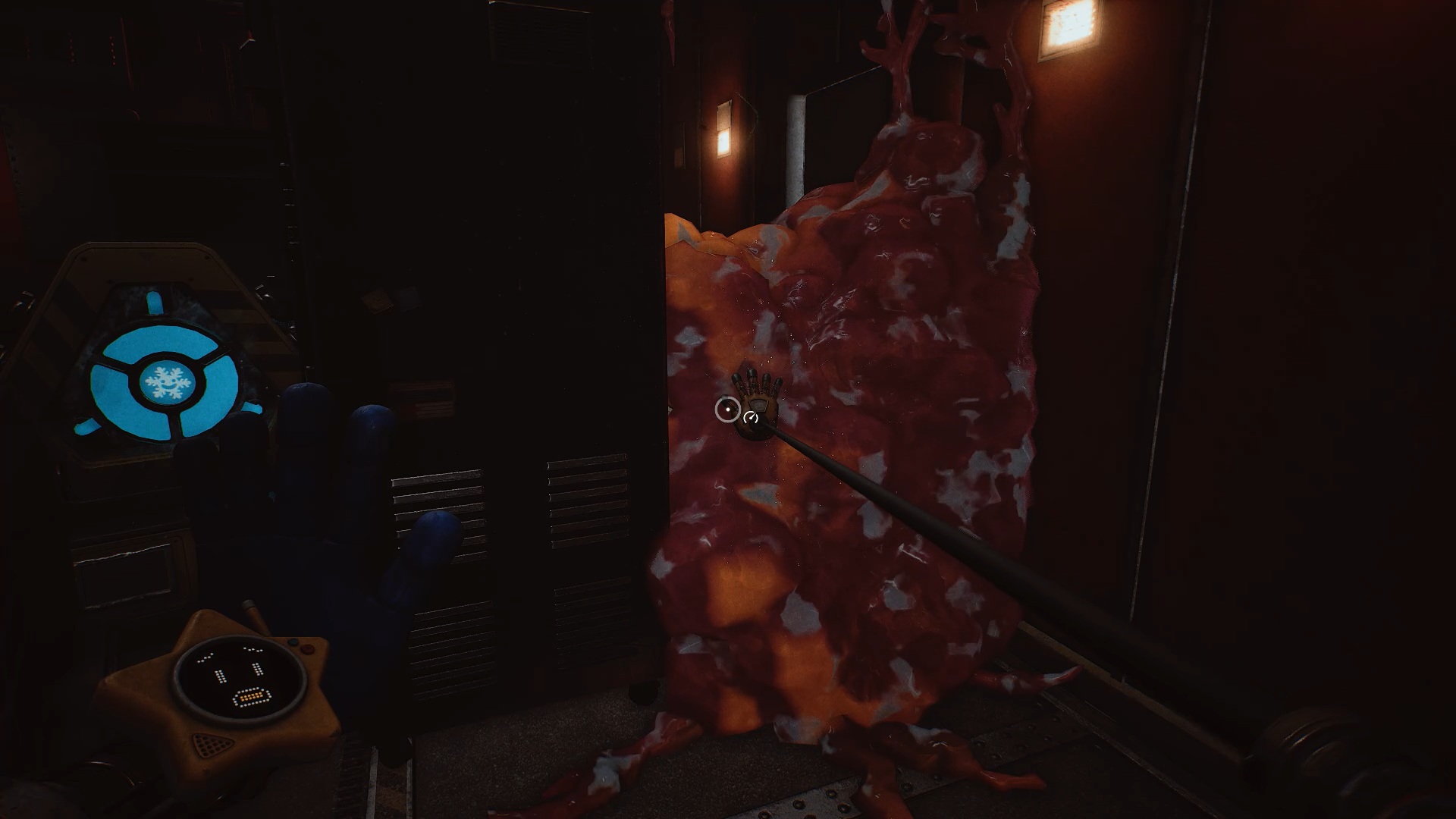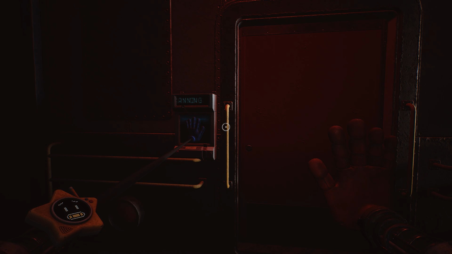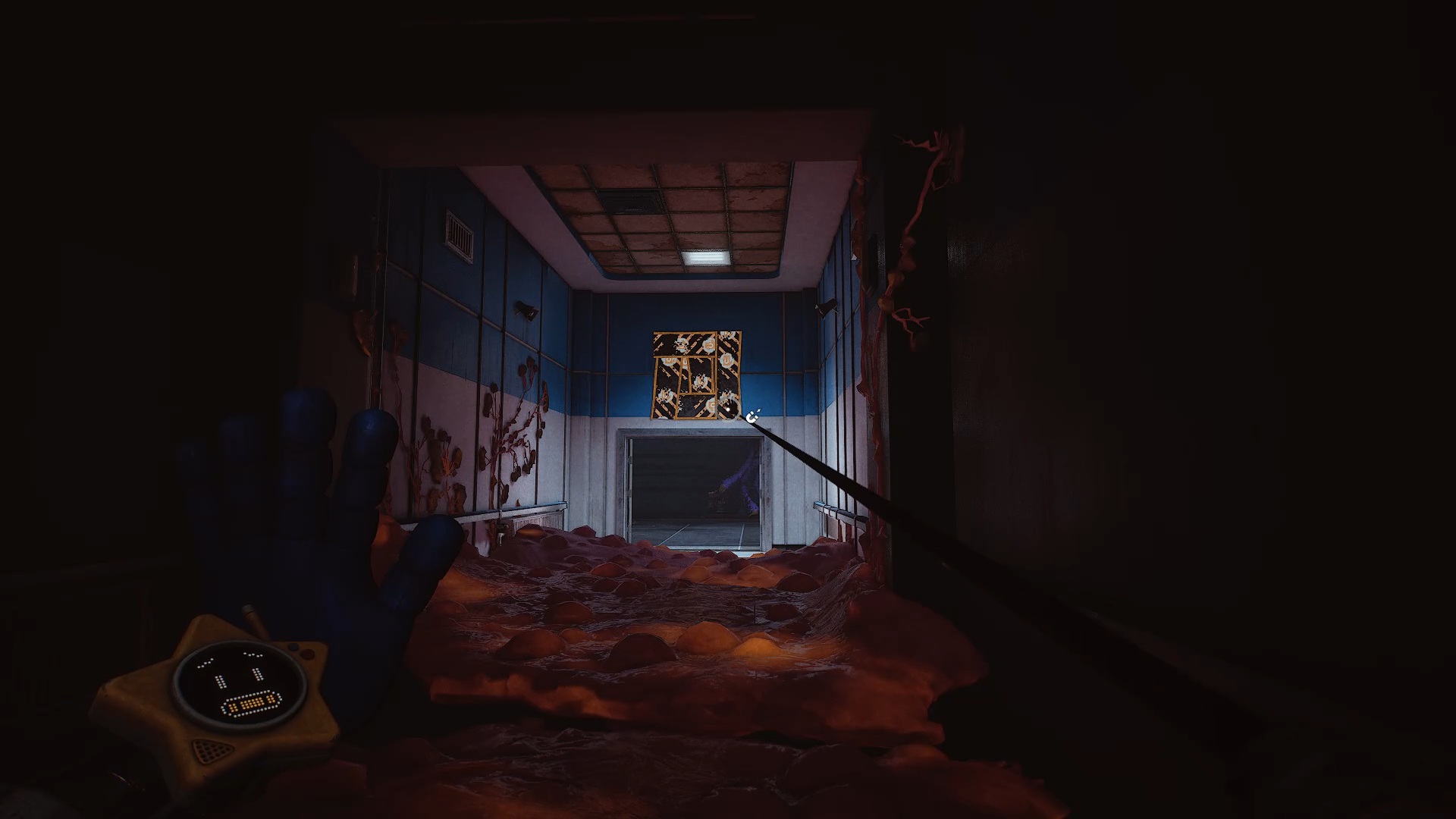 À la réception, franchissez la porte bleue, puis traversez plusieurs portes jusqu’à atteindre une vitre à moitié brisée. Utilisez votre main à pression pour passer au travers. Une nouvelle tâche vous est alors confiée : rétablir le courant.