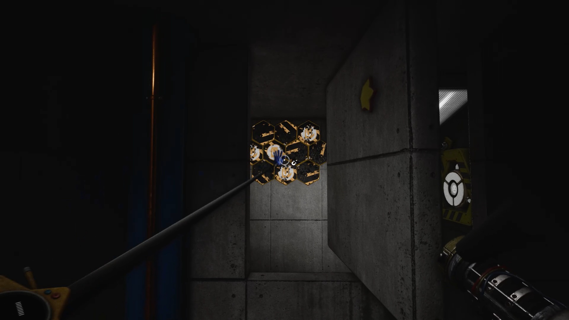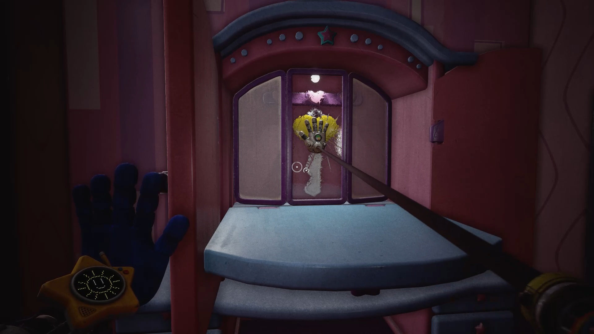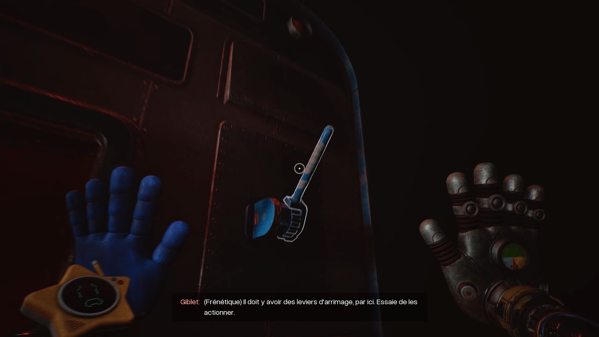Vous atteindrez une nouvelle cage d’escalier. Utilisez une fois encore vos deux mains et les poignées suspendues pour grimper jusqu’au cinquième étage. Une fois sur place, servez-vous de la main bleue pour déverrouiller le scanner. À l’intérieur, utilisez la main à pression afin de dégager le passage. De l’autre côté, appliquez la main à pression sur le réservoir, puis actionnez le levier avec la main bleue lorsque le niveau du liquide se situe entre les marqueurs. Vous débloquerez ainsi la porte.