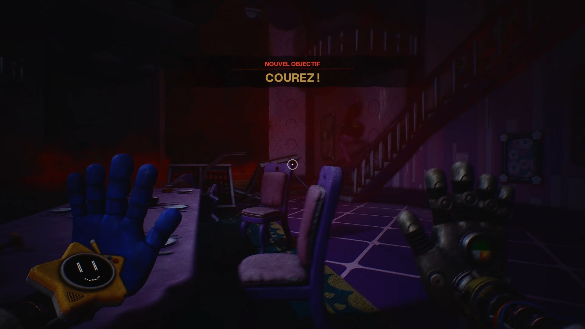 Après la cinématique,vous devez fuir. Attention vous ne pourrez pas restez immobile. Fuyez en empruntant l’escalier pour atteindre l’étage. Une fois en haut, passez par la porte à gauche, glissez-vous sous les décombres de la passerelle, puis utilisez la plateforme au loin pour rejoindre l’autre côté. Faites de même dans les hauteurs du salon et passez rapidement la chambre pour atteindre les coulisses afin d’échapper à Lily. Utilisez ensuite la trappe en hauteur pour accéder au grenier.