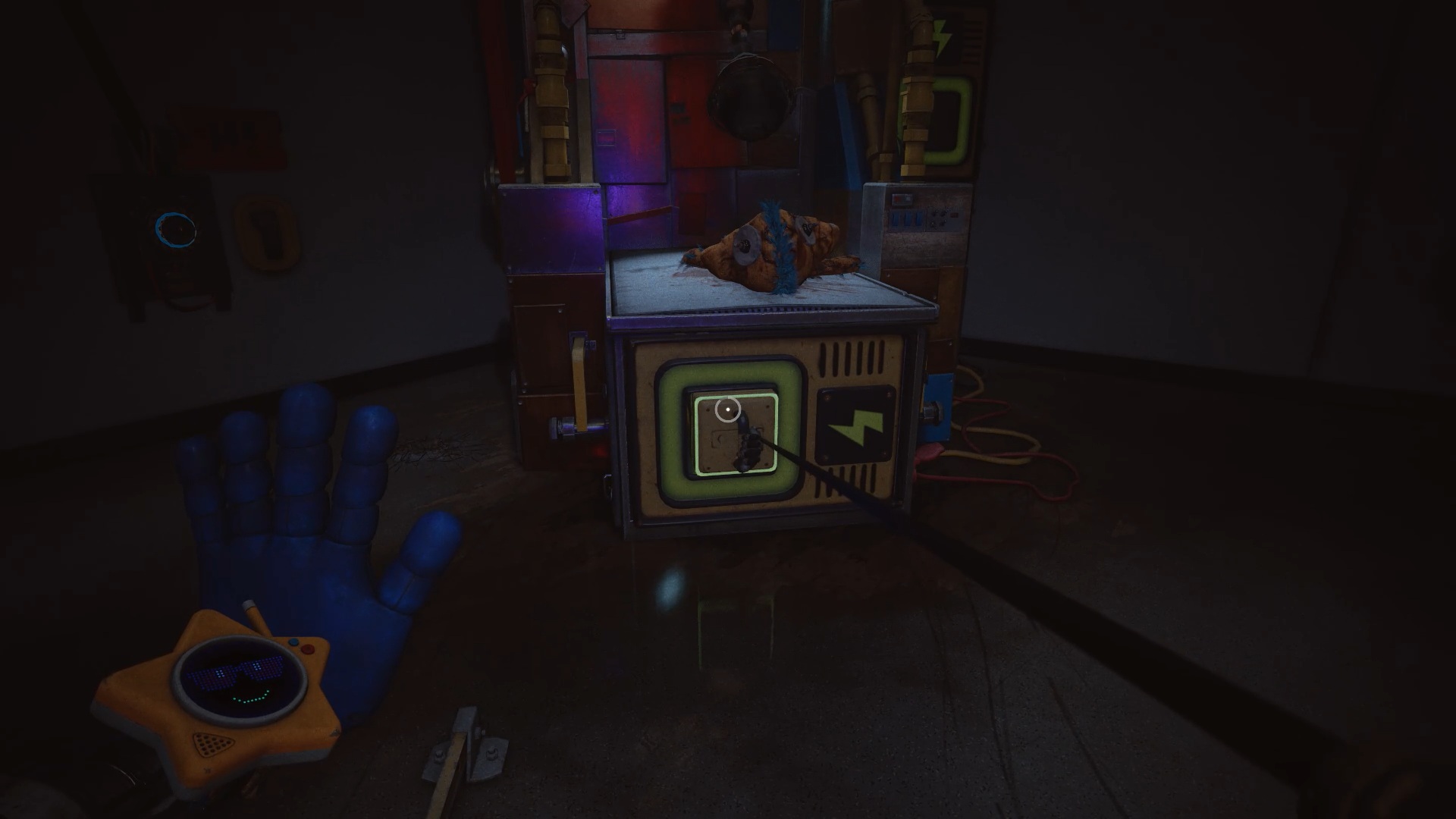 Après la course-poursuite face à Huggy, vous devrez l’affronter. Utilisez les socles d’électricité à proximité pour alimenter les projecteurs et le distraire. Lorsqu’il est aveuglé, Huggy ouvre des passages dans la zone. Fouillez l’un de ces passages, près d’une porte rouge, afin de récupérer un générateur. Déplacez-le jusqu’au socle situé près de la porte violette fermée, puis insérez-le pour l’alimenter.