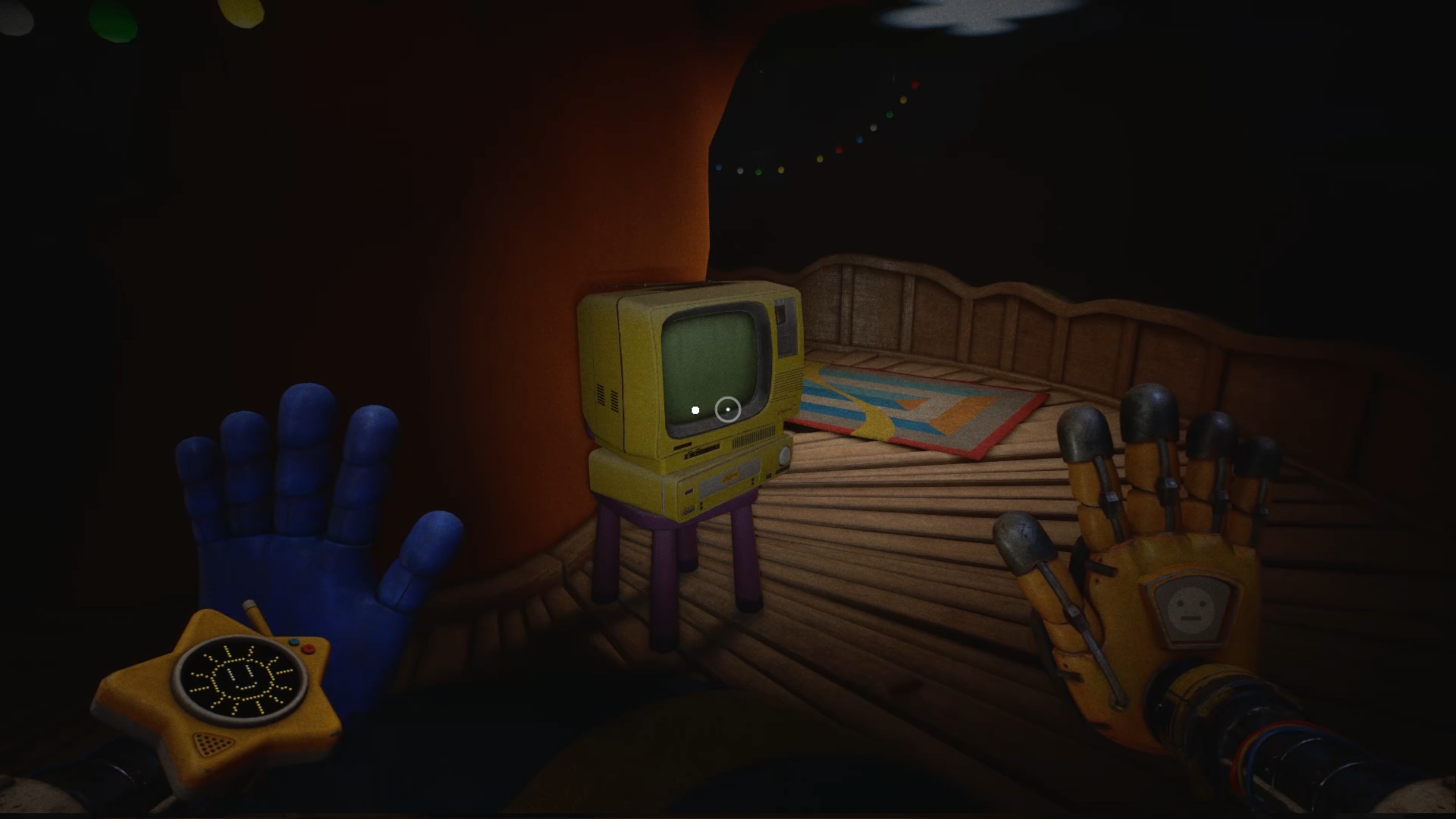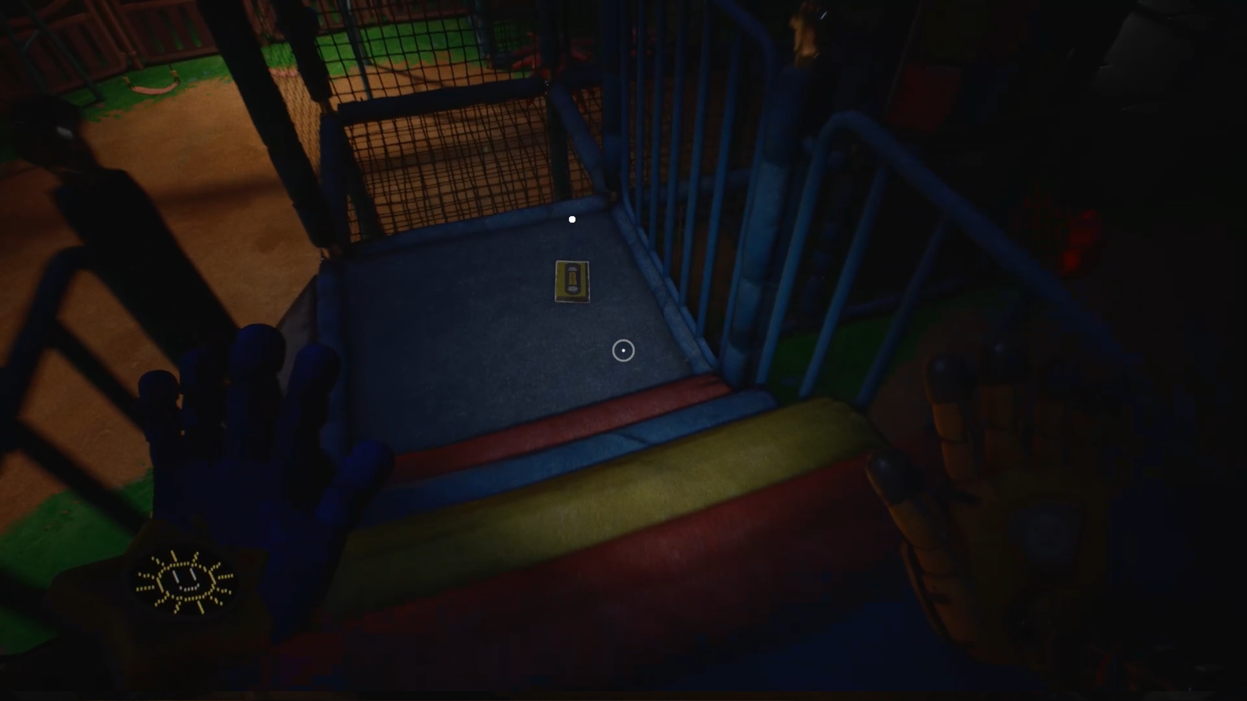 Vous atterrissez dans un circuit où un véhicule vous permet de vous déplacer à travers un manège. Pour progresser, examinez la zone au-dessus du véhicule afin de repérer une plateforme. Utilisez votre gant à pression pour la faire tomber, puis inspectez-la pour y trouver un socle d’électricité. Servez-vous de votre main conductrice pour alimenter le véhicule, puis appuyez sur le bouton à l’intérieur afin de démarrer. Plus loin, rendez-vous dans l’aire de jeu pour trouver une cassette. Vous pouvez la visionner dans le magnétoscope situé au-dessus de la cabane si vous le souhaitez.