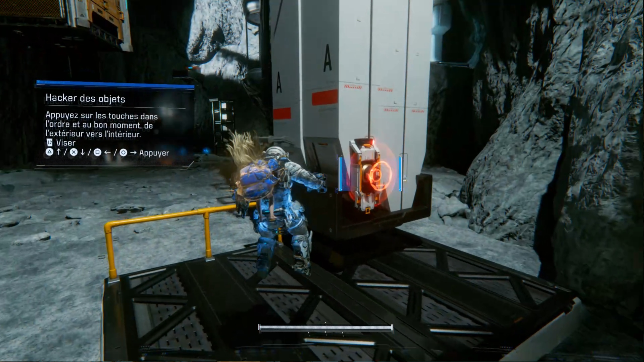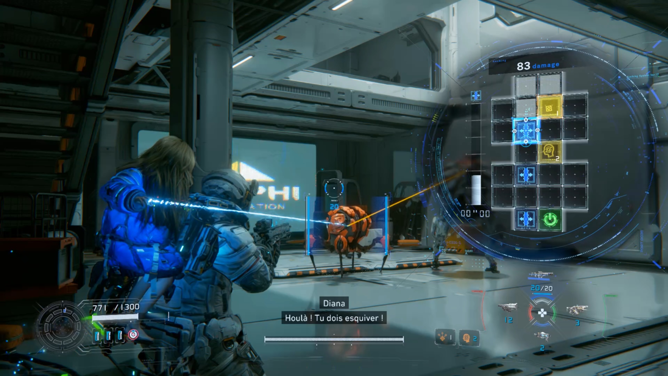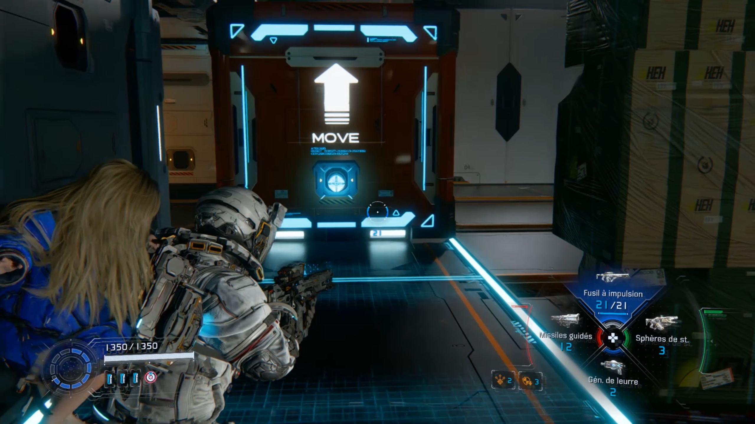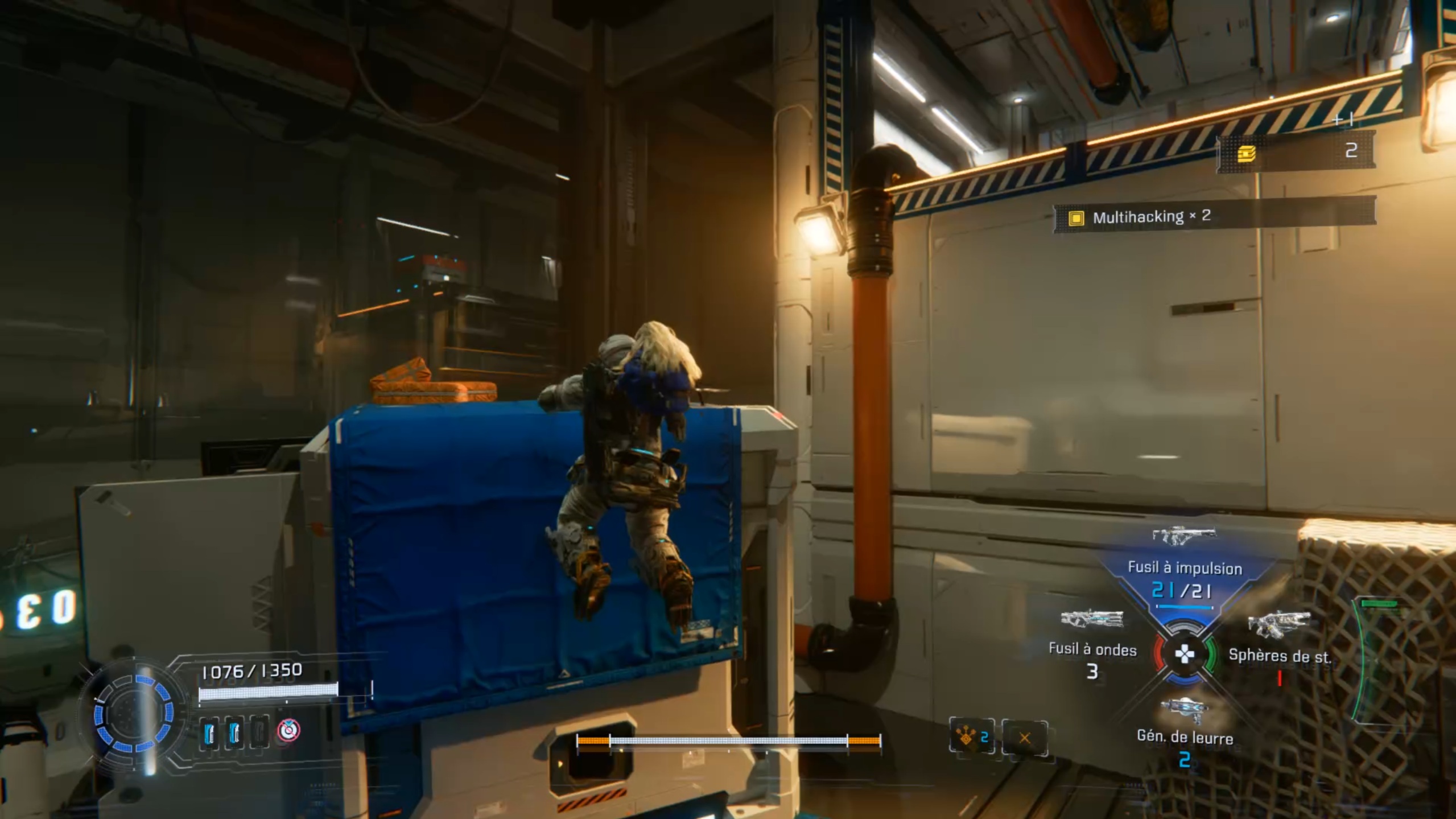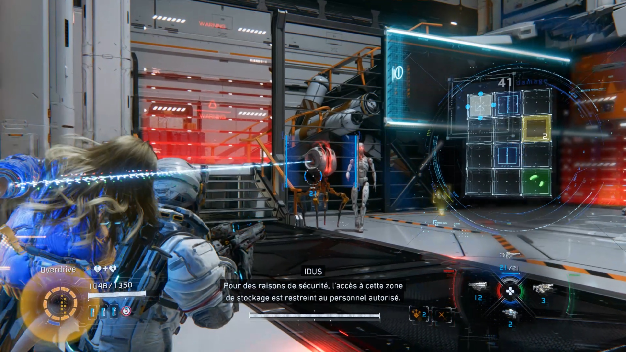 Dans l’entrepôt, prenez l’ascenseur pour faire face à un puzzle. Déplacez la première caisse grâce à la capacité de hack, puis une seconde plus loin afin de révéler un nouveau passage. Éliminez ensuite les robots qui vous font face.