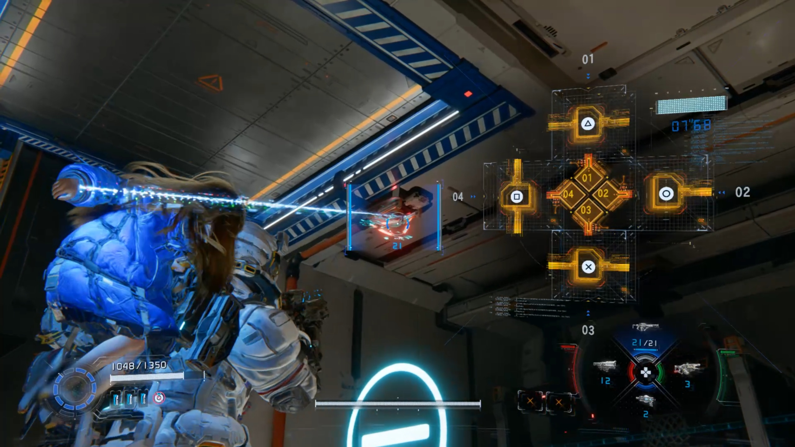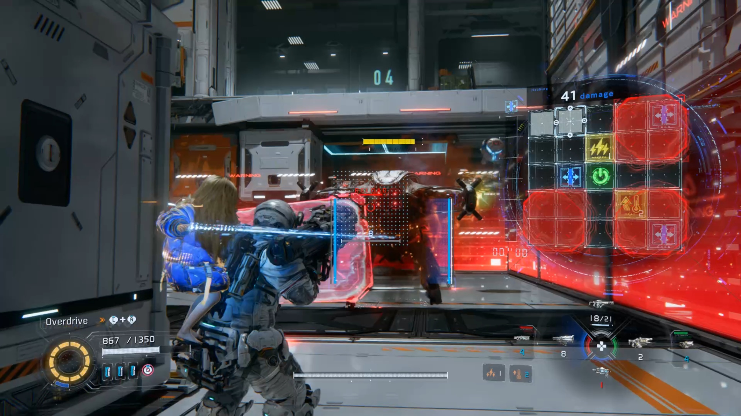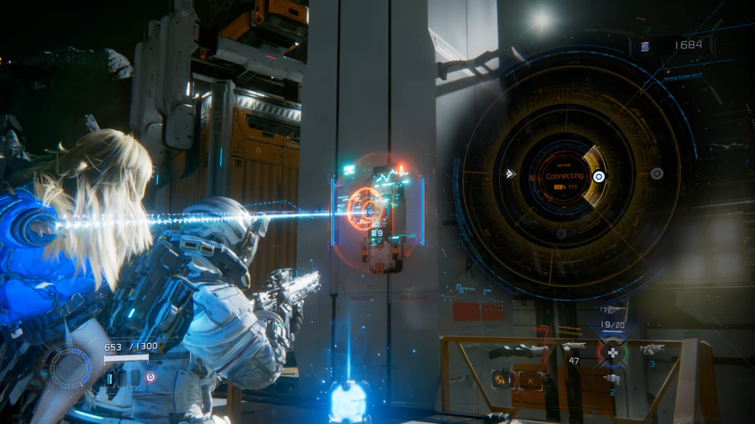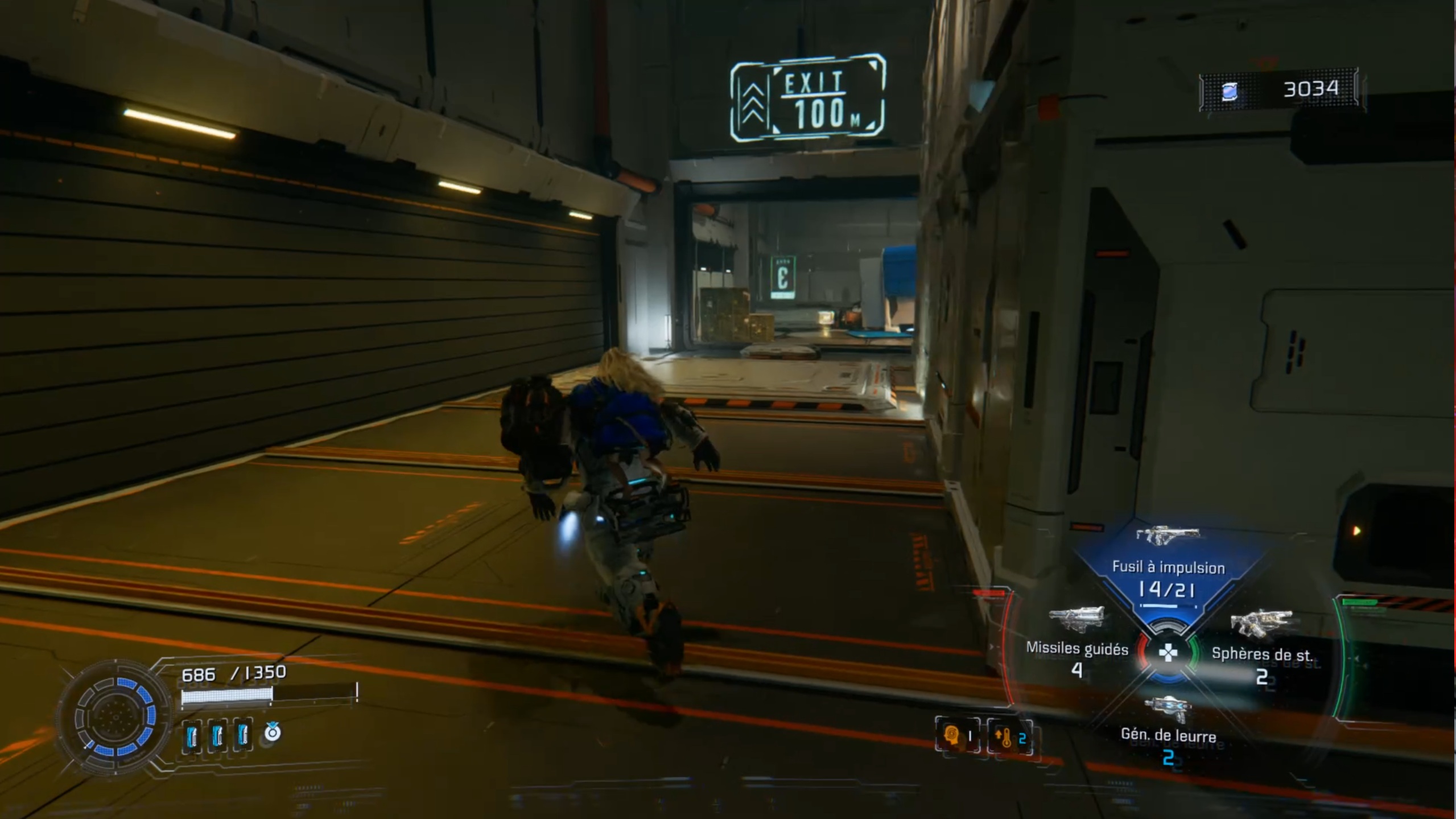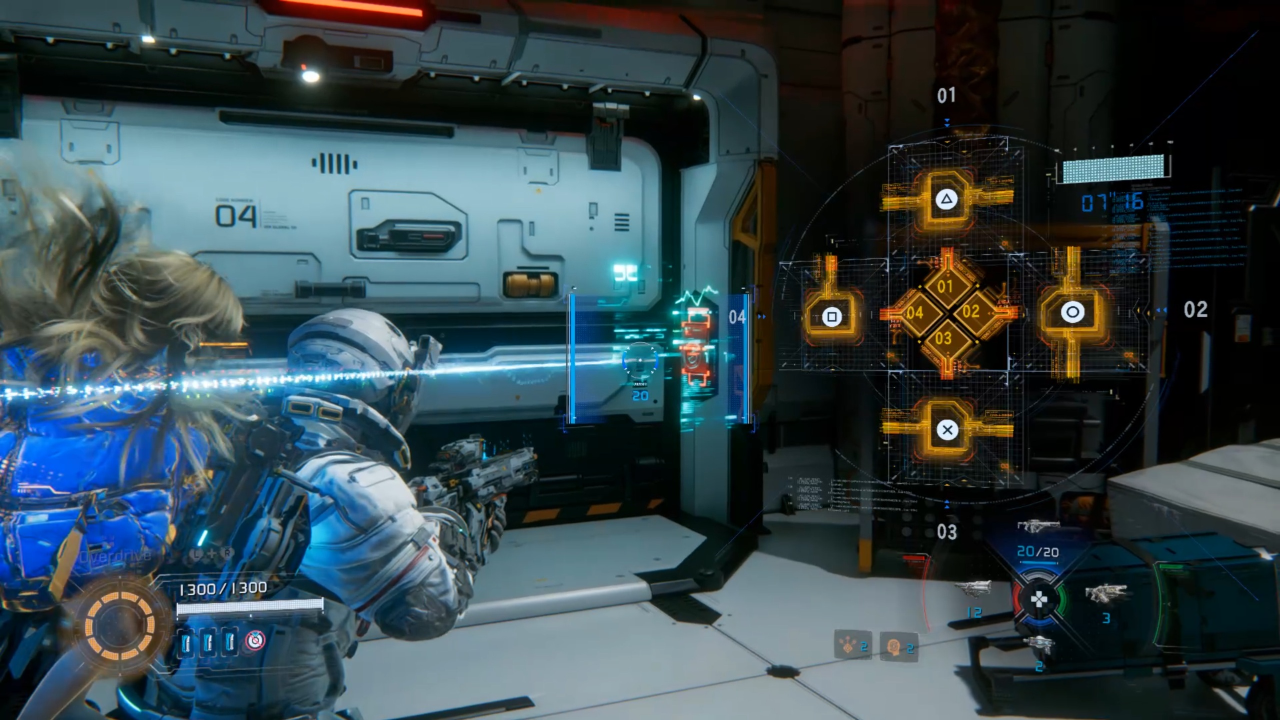 Dans l’entrepôt, prenez l’ascenseur pour faire face à un puzzle. Déplacez la première caisse grâce à la capacité de hack, puis une seconde plus loin afin de révéler un nouveau passage. Éliminez ensuite les robots qui vous font face.