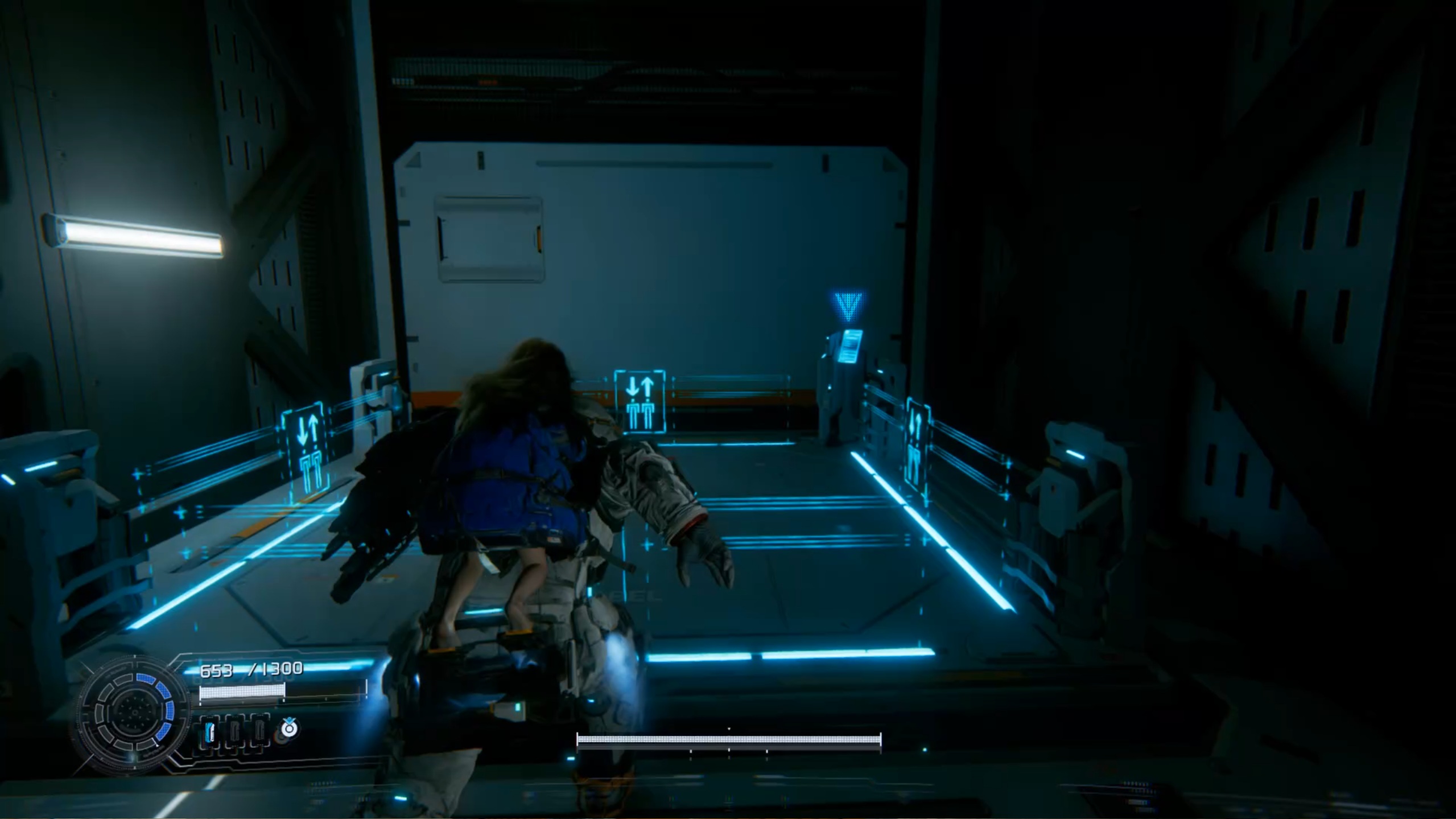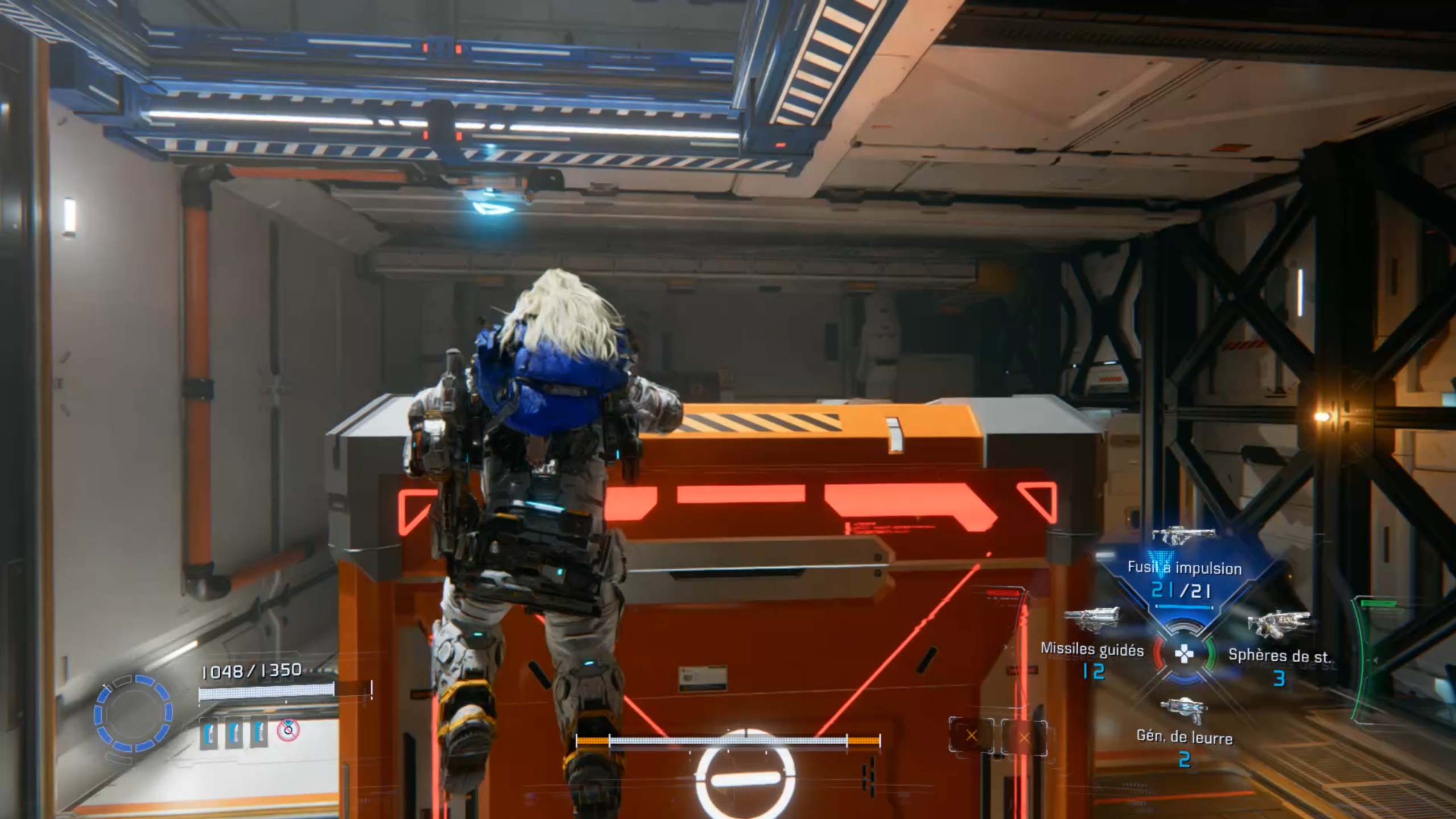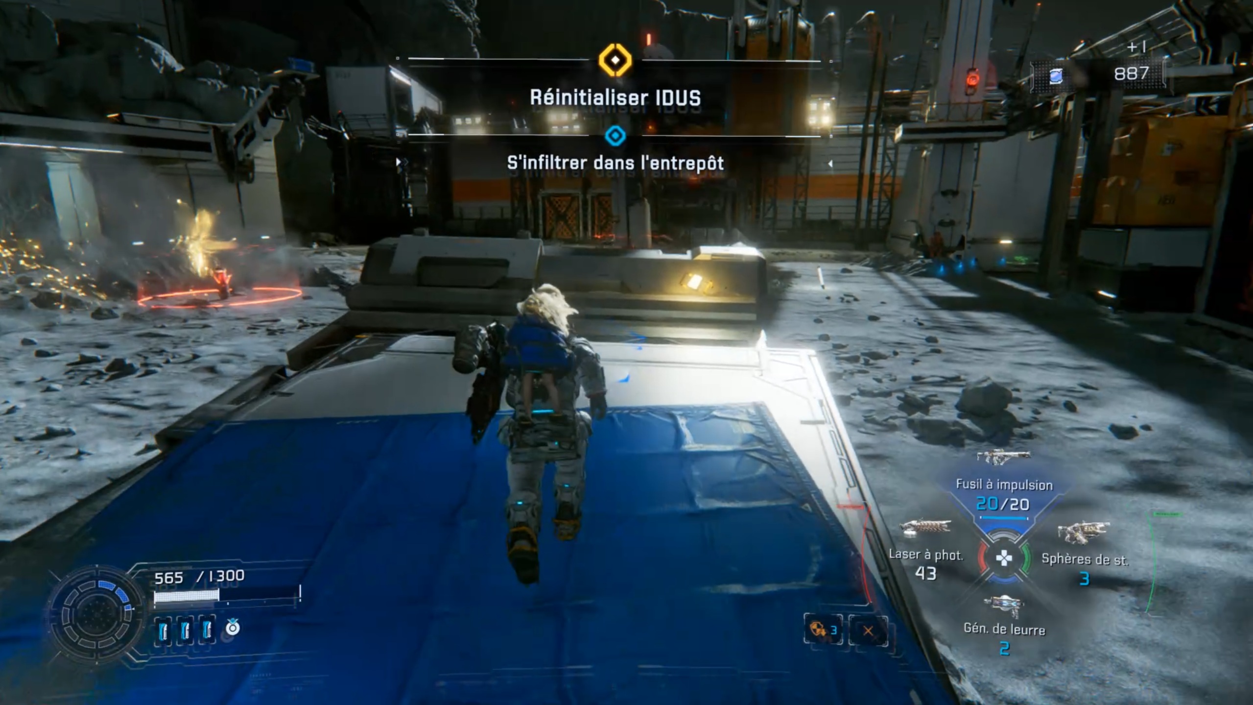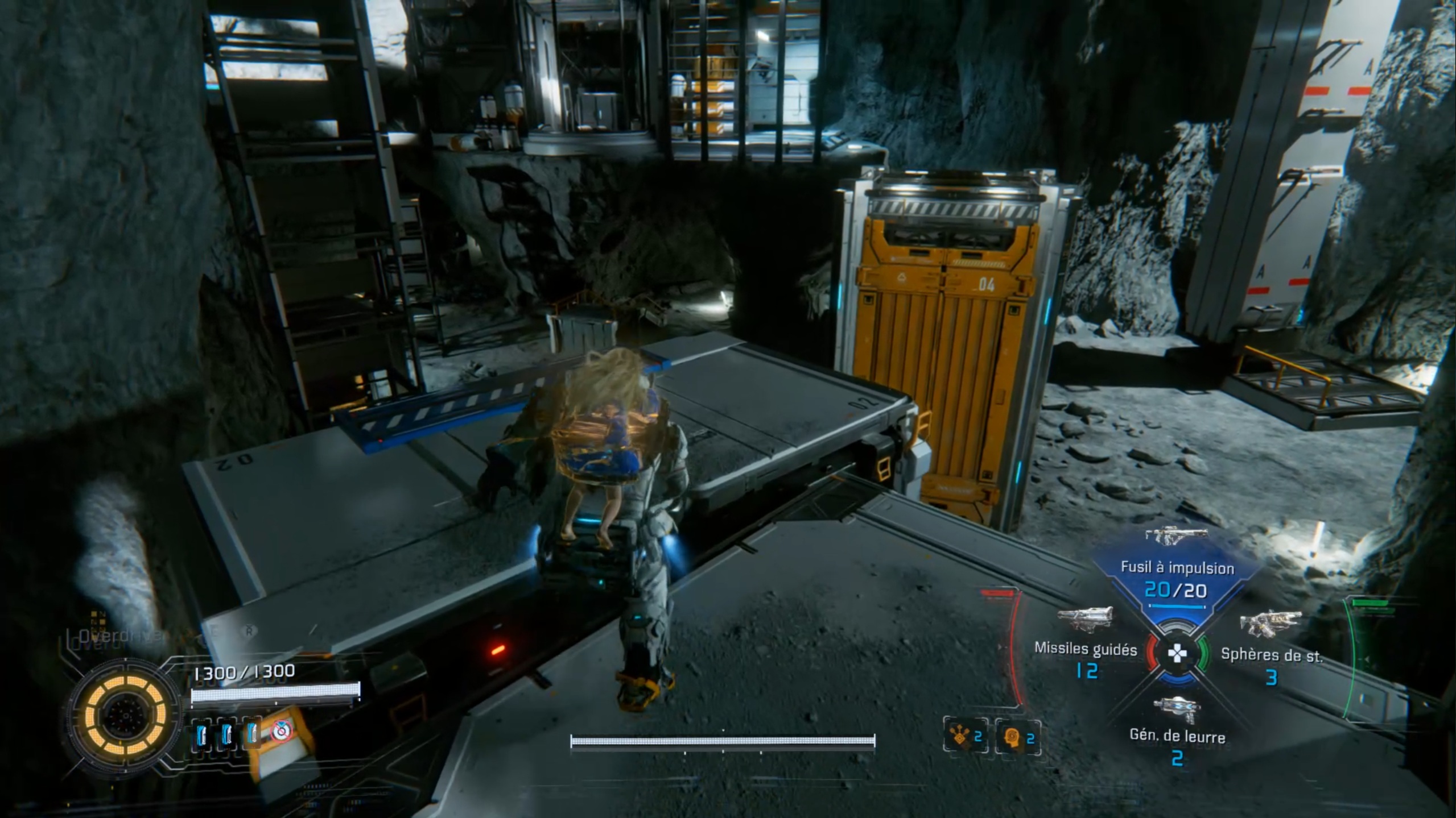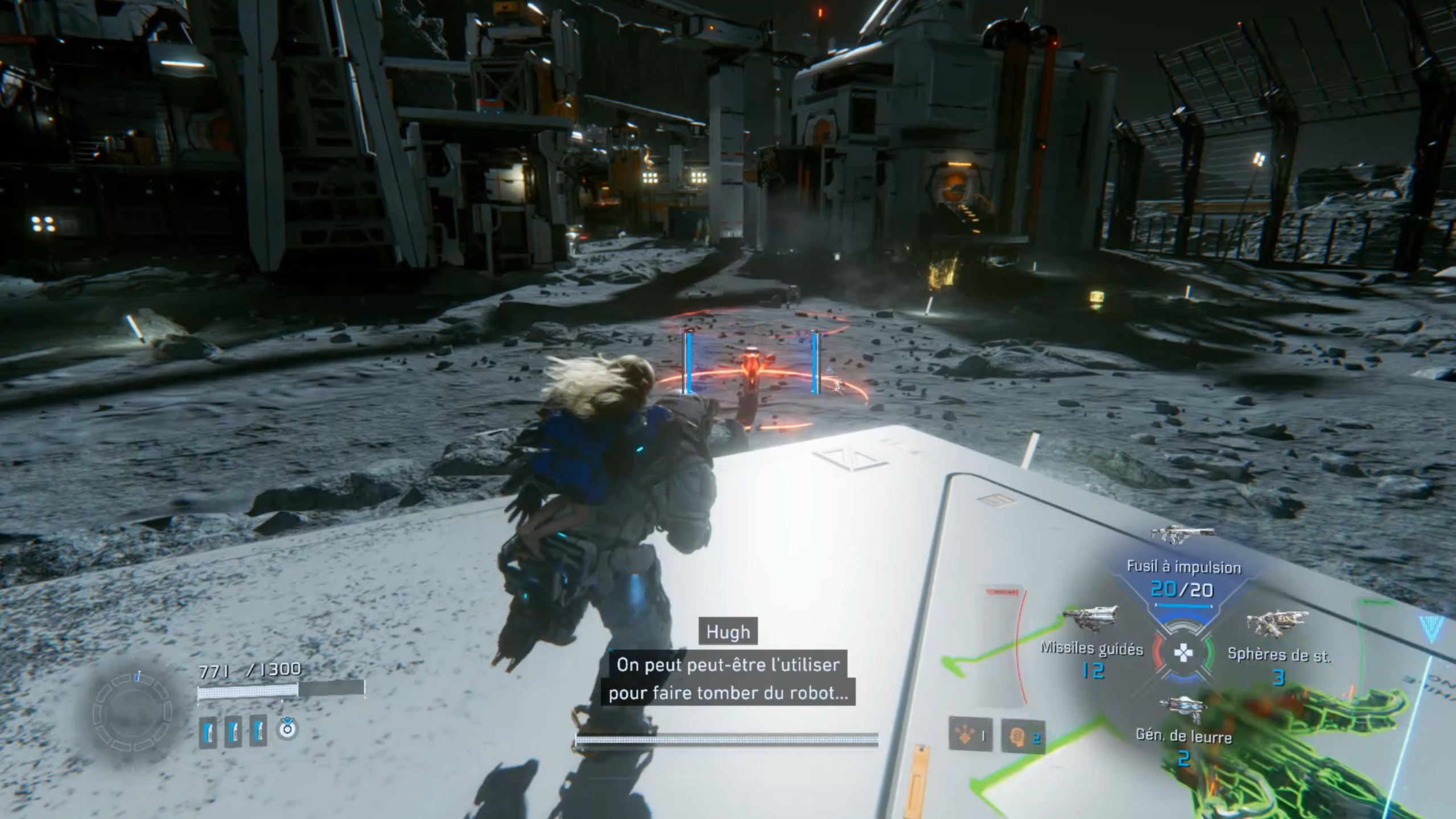À l’extérieur, utilisez les plateformes pour éviter de toucher le sol. Vous pouvez utiliser les mines à proximité pour dévier le robot de sa trajectoire. Rejoignez le sas le plus proche afin d’entrer dans un bâtiment. À l’intérieur, un combat se déclenche : éliminez les ennemis, puis montez sur le balcon à l’étage pour activer un interrupteur et faire descendre un conteneur à l’extérieur.