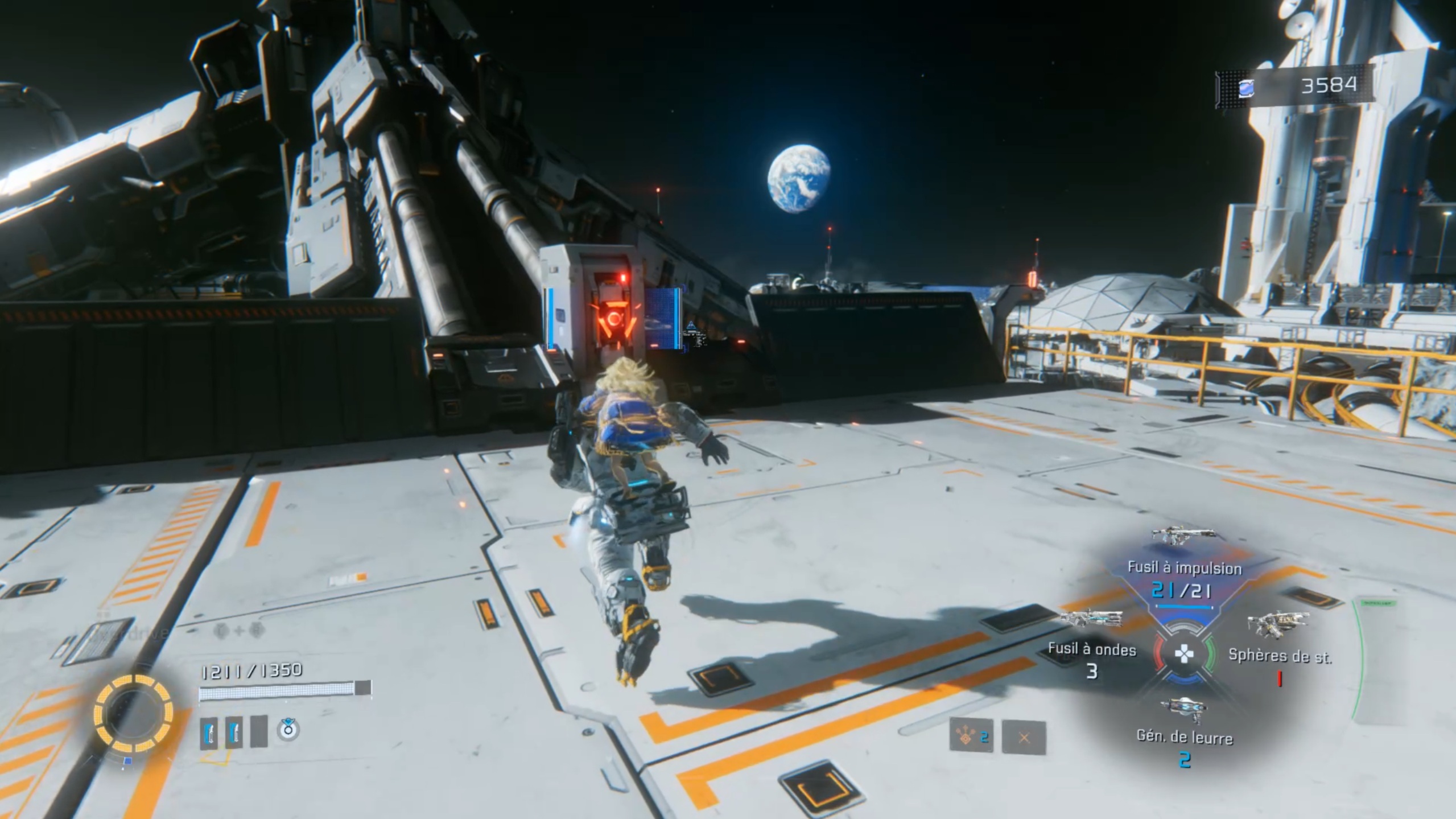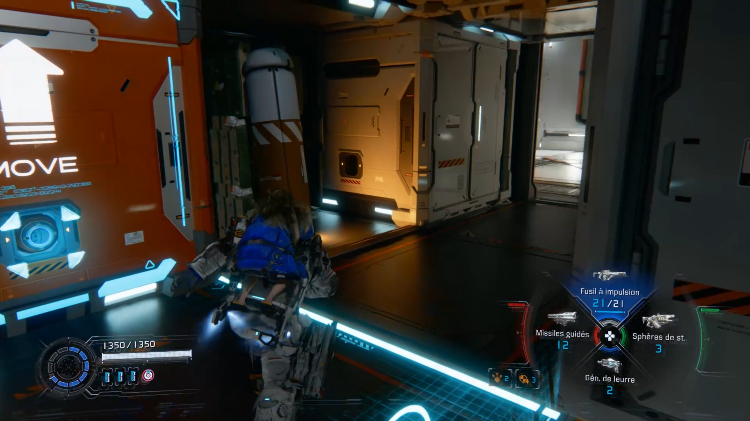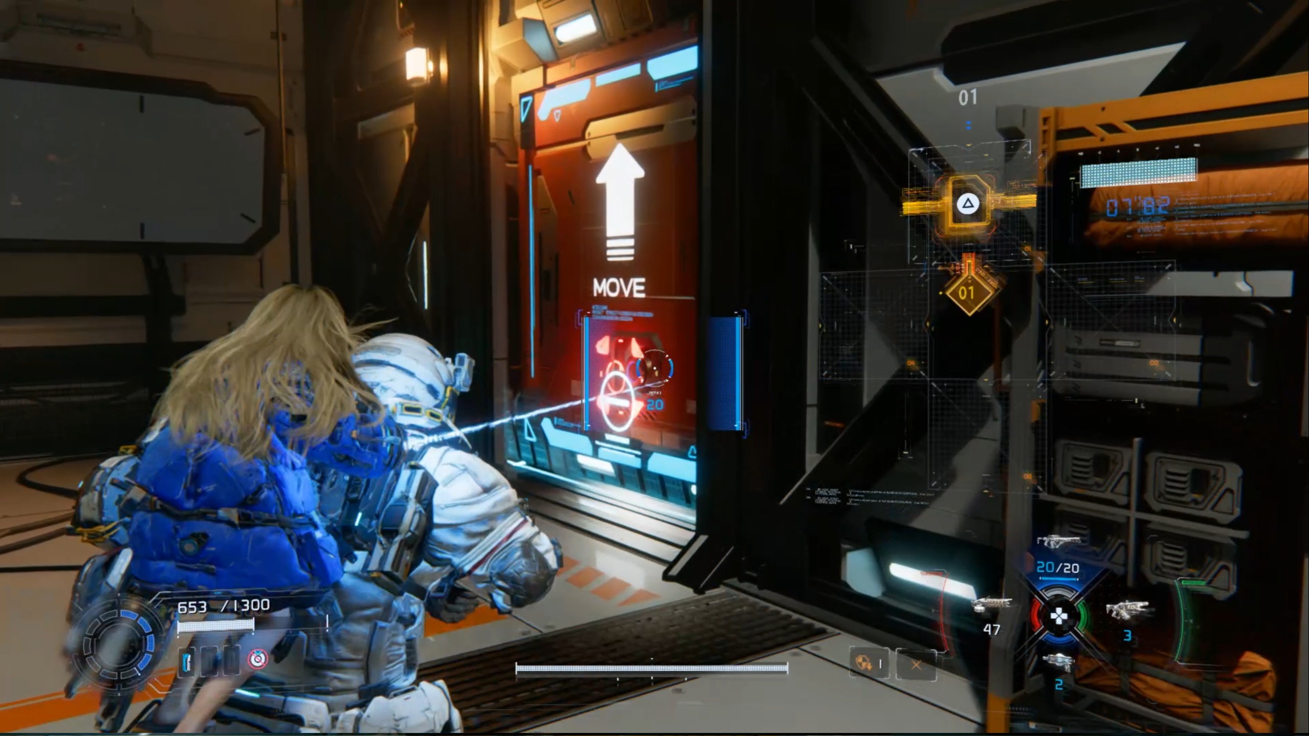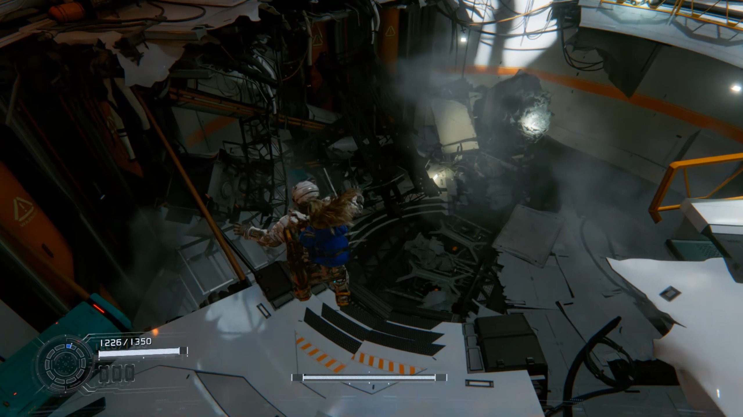 À l’extérieur, utilisez les plateformes pour éviter de toucher le sol. Vous pouvez utiliser les mines à proximité pour dévier le robot de sa trajectoire. Rejoignez le sas le plus proche afin d’entrer dans un bâtiment. À l’intérieur, un combat se déclenche : éliminez les ennemis, puis montez sur le balcon à l’étage pour activer un interrupteur et faire descendre un conteneur à l’extérieur.