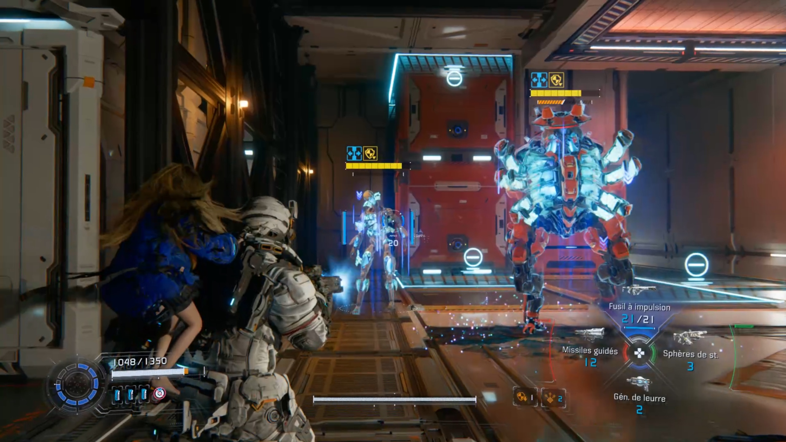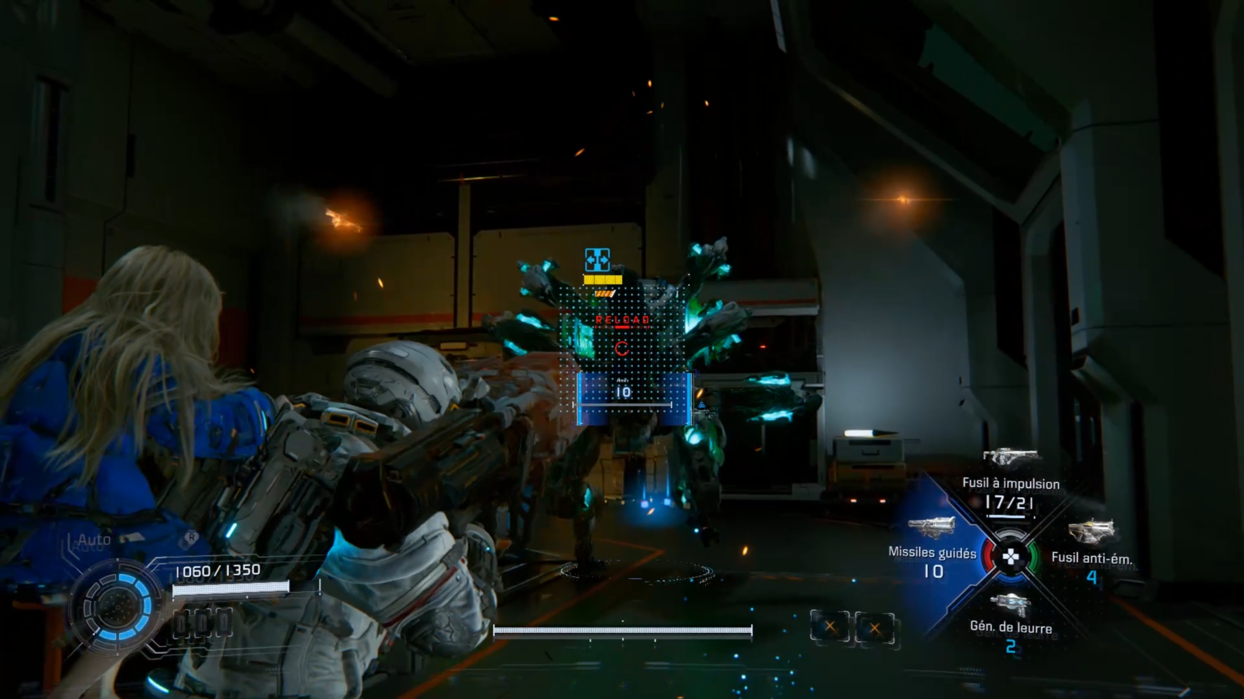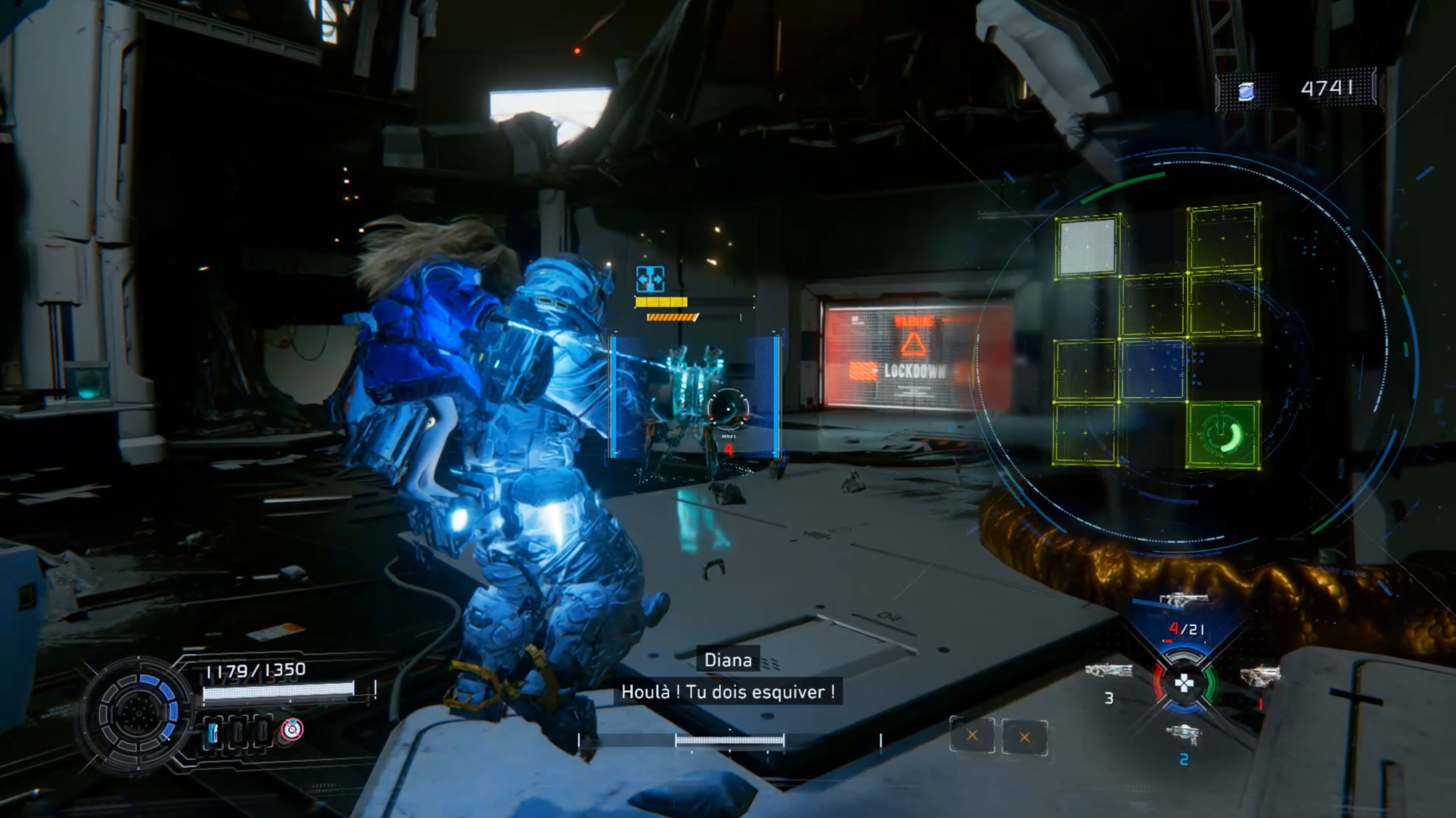 Après le combat, interagissez avec un interrupteur au plafond pour ouvrir une trappe. Déplacez les caisses à proximité afin de vous aider à monter. Éliminez les robots, puis affrontez un nouveau robot : tirez sur les brouilleurs situés sur sa tête pour pouvoir le hacker et le vaincre. Utilisez ensuite l’escalier pour trouver un nouvel interrupteur et poursuivre votre progression.