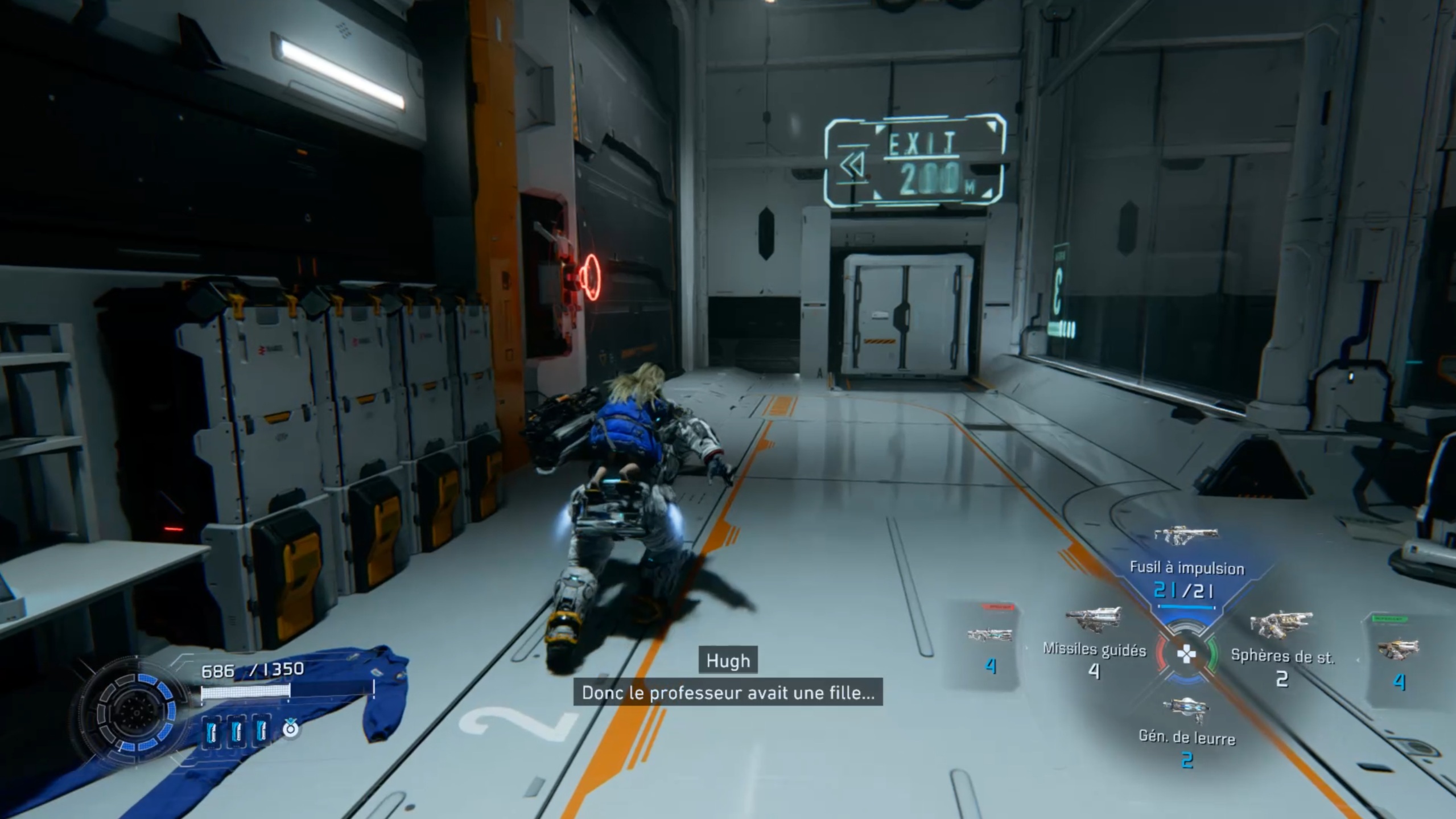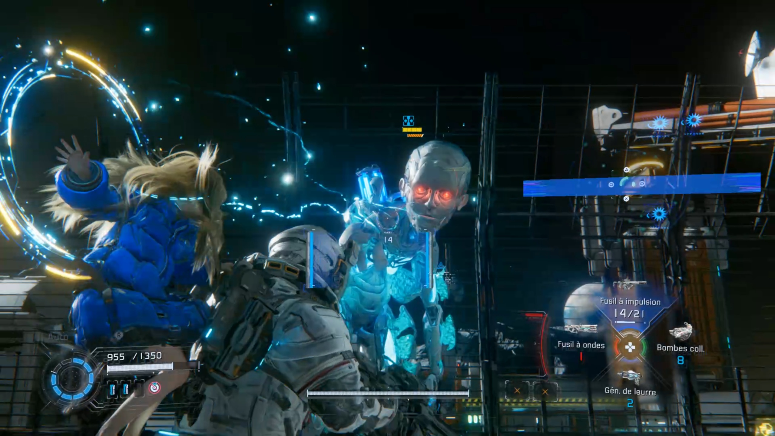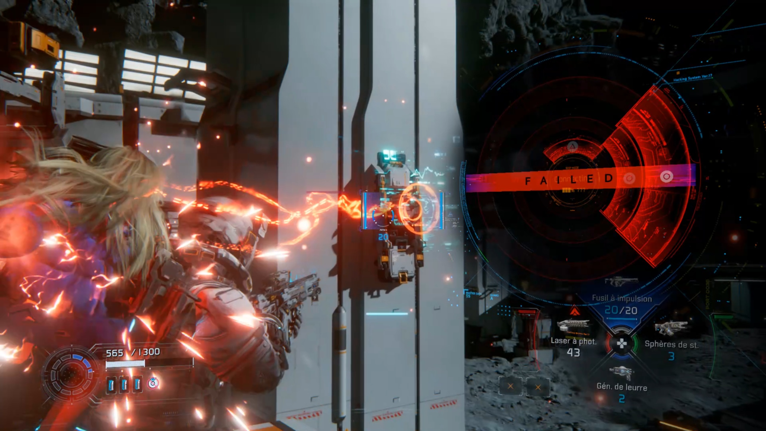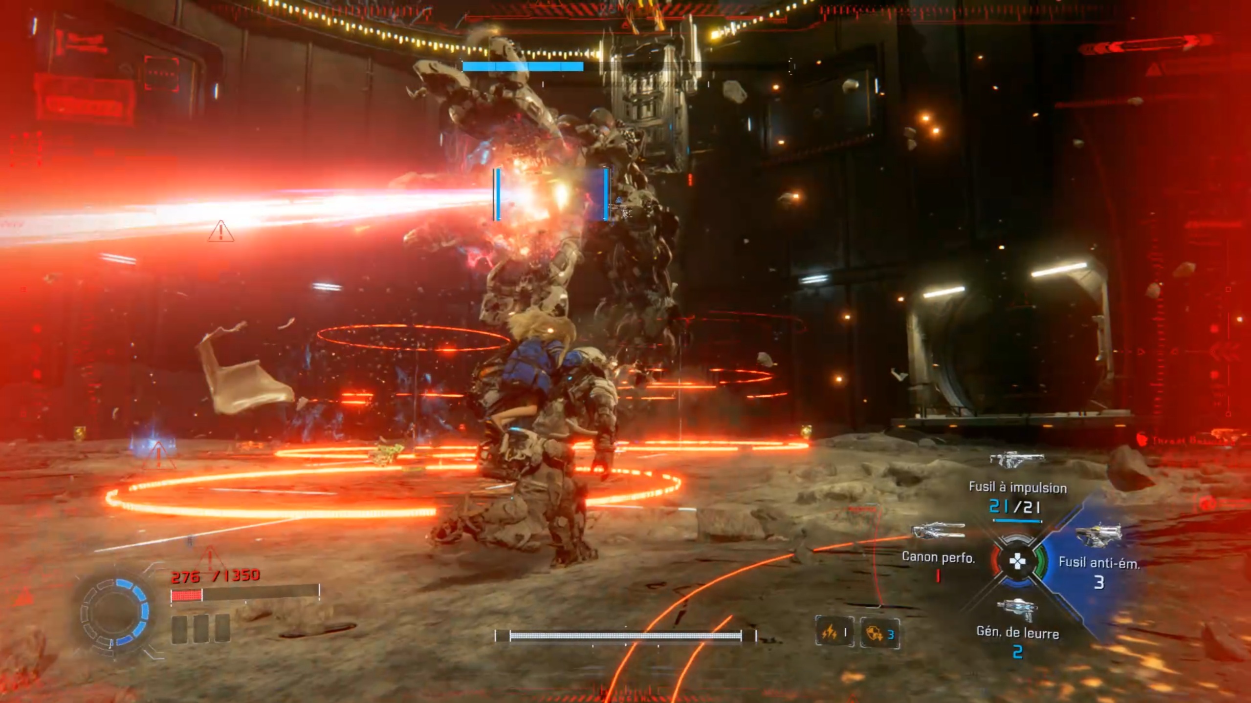Après le combat, interagissez avec un interrupteur au plafond pour ouvrir une trappe. Déplacez les caisses à proximité afin de vous aider à monter. Éliminez les robots, puis affrontez un nouveau robot : tirez sur les brouilleurs situés sur sa tête pour pouvoir le hacker et le vaincre. Utilisez ensuite l’escalier pour trouver un nouvel interrupteur et poursuivre votre progression.