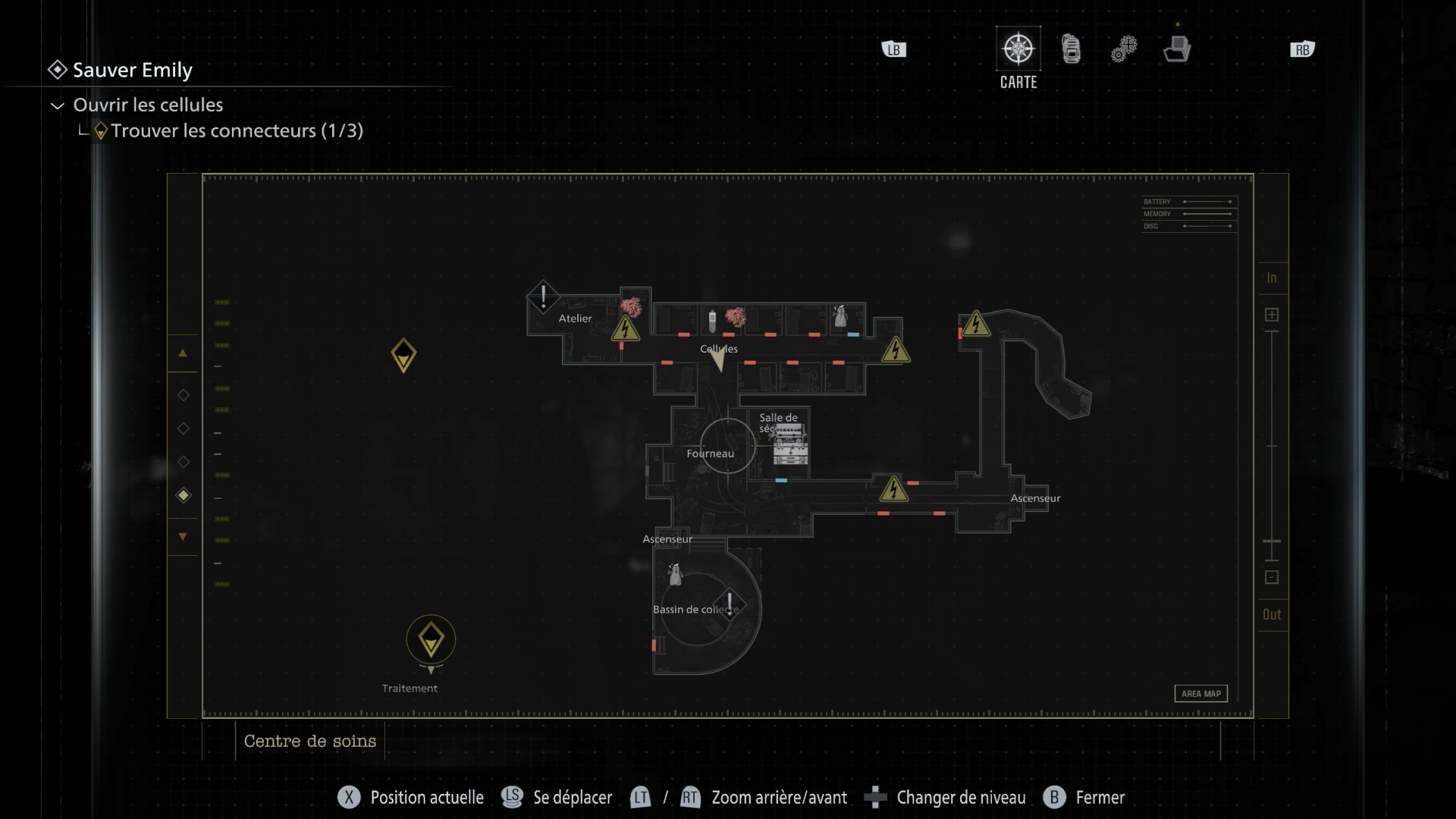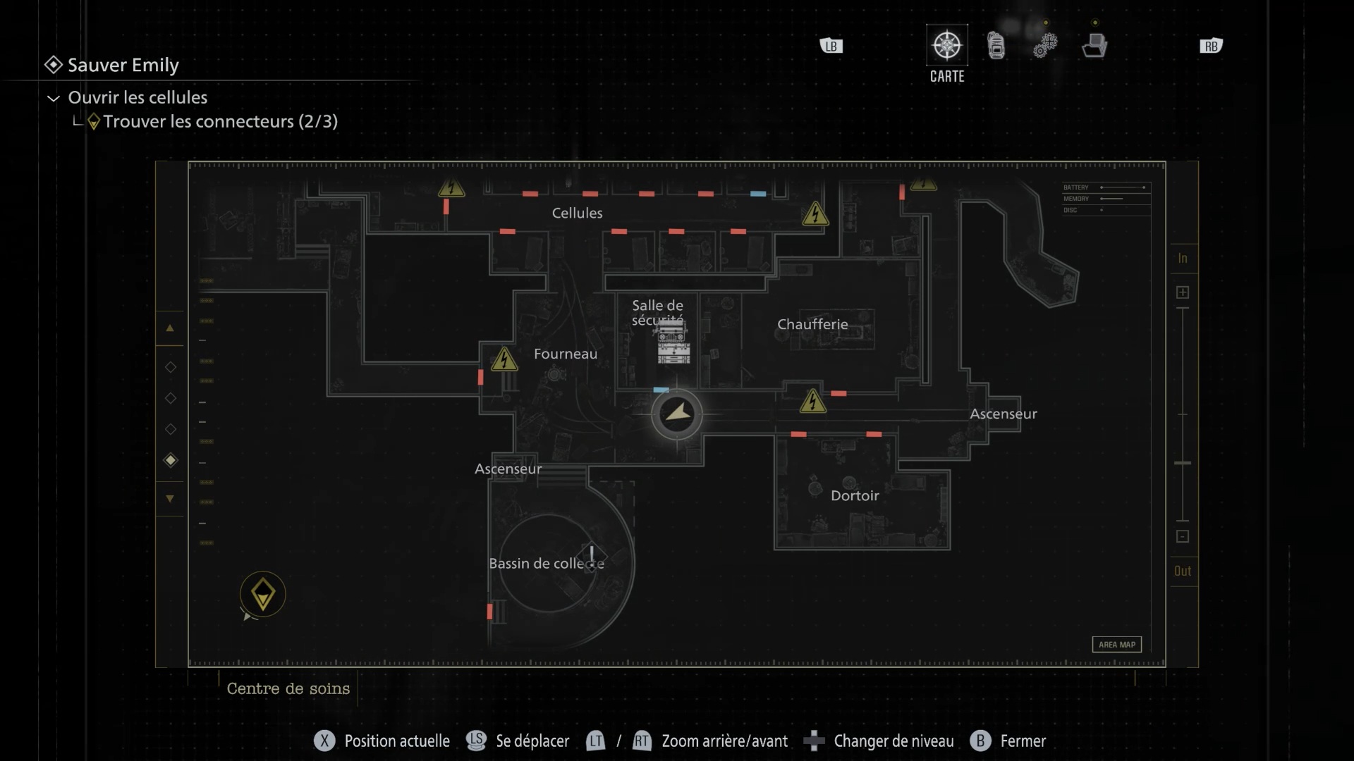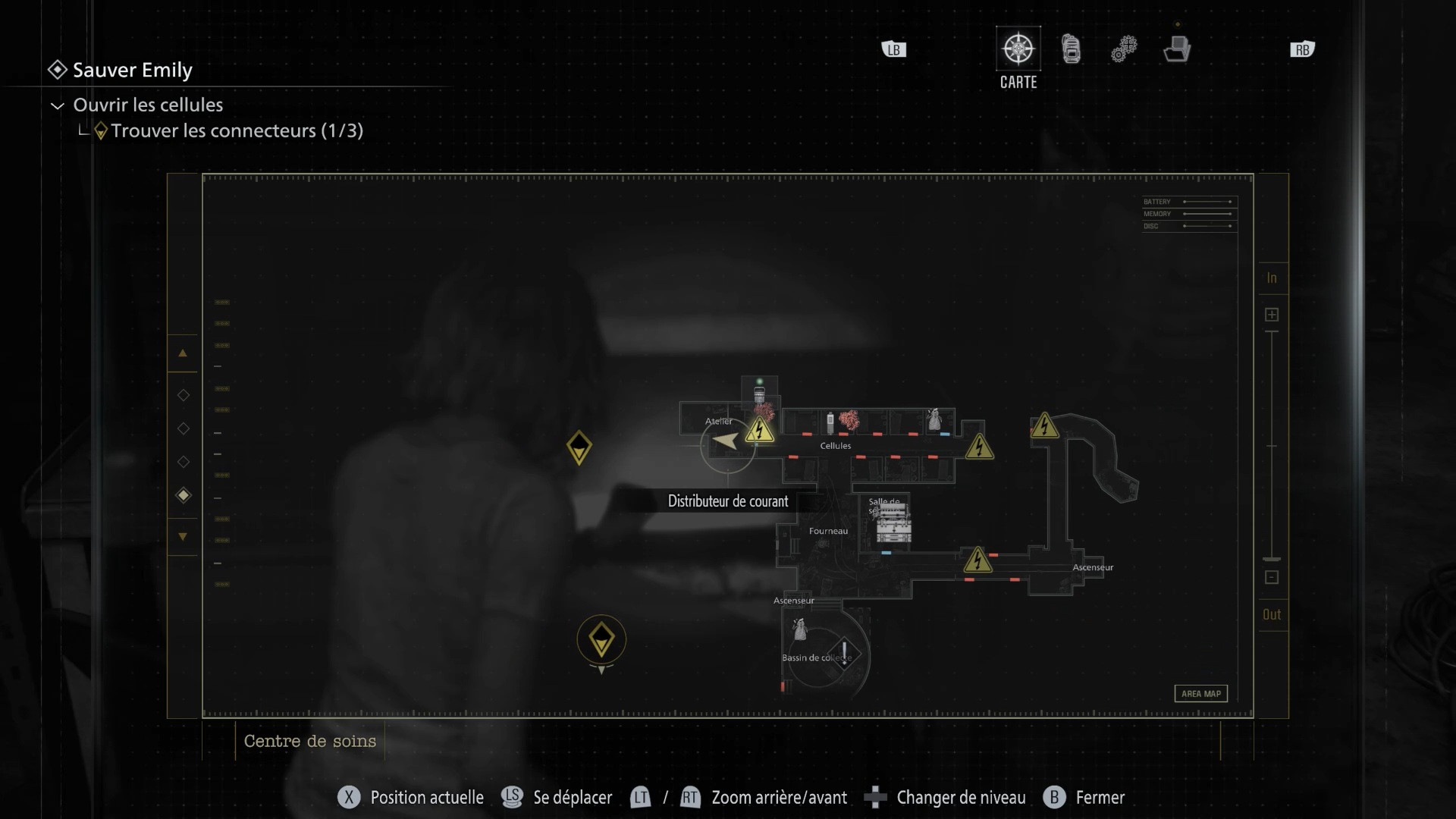 Descendez dans le bassin pour déclencher un combat. Tirez sur les membres inférieurs des zombies afin de les faire tomber et poursuivre votre progression. Montez à l’échelle pour récupérer le dernier connecteur en hauteur. Revenez sur vos pas pour retirer le connecteur de la zone d’inspection, puis celui du fourneau. Rendez-vous ensuite dans les cellules pour insérer les trois connecteurs et libérer Emily. Suivez enfin le chemin vers l’ascenseur afin de sortir des sous-sols du centre de soins.