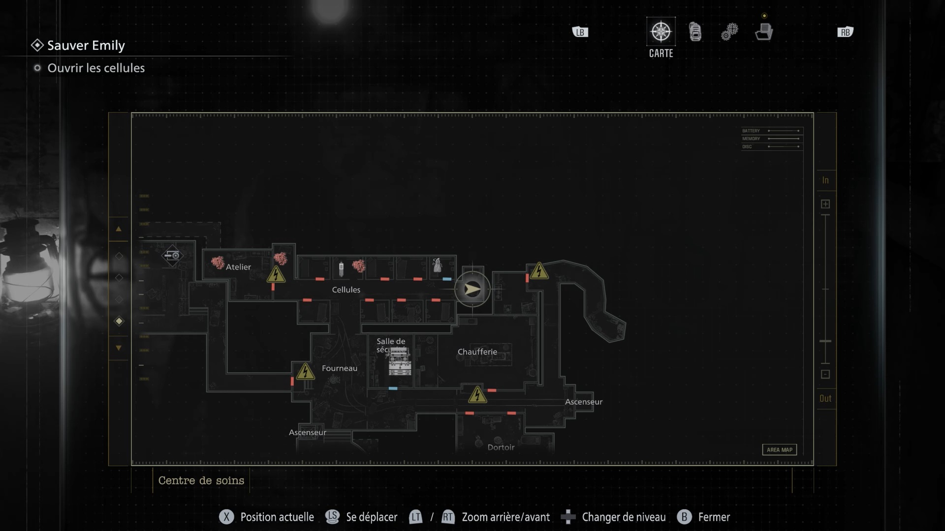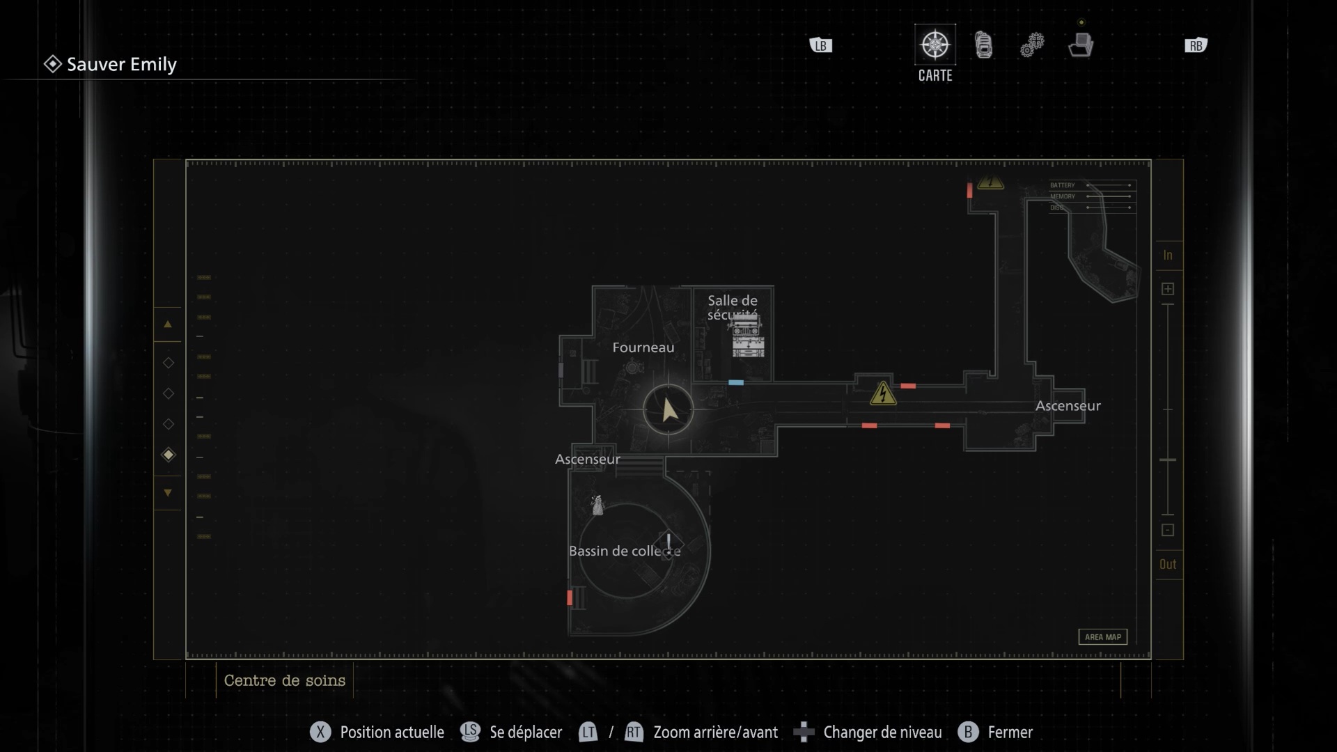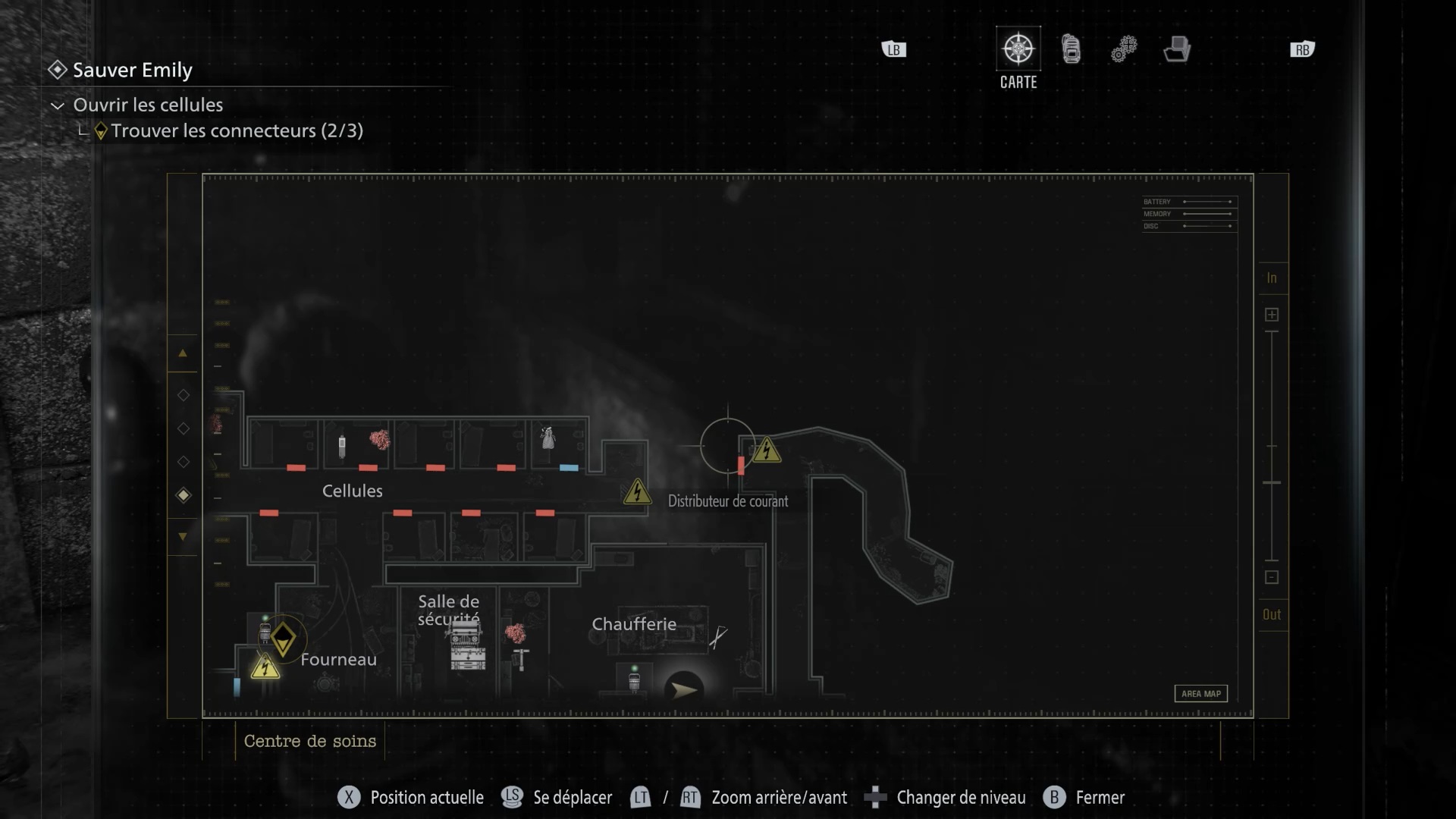Descendez dans le bassin pour déclencher un combat. Tirez sur les membres inférieurs des zombies afin de les faire tomber et poursuivre votre progression. Montez à l’échelle pour récupérer le dernier connecteur en hauteur. Revenez sur vos pas pour retirer le connecteur de la zone d’inspection, puis celui du fourneau. Rendez-vous ensuite dans les cellules pour insérer les trois connecteurs et libérer Emily. Suivez enfin le chemin vers l’ascenseur afin de sortir des sous-sols du centre de soins.