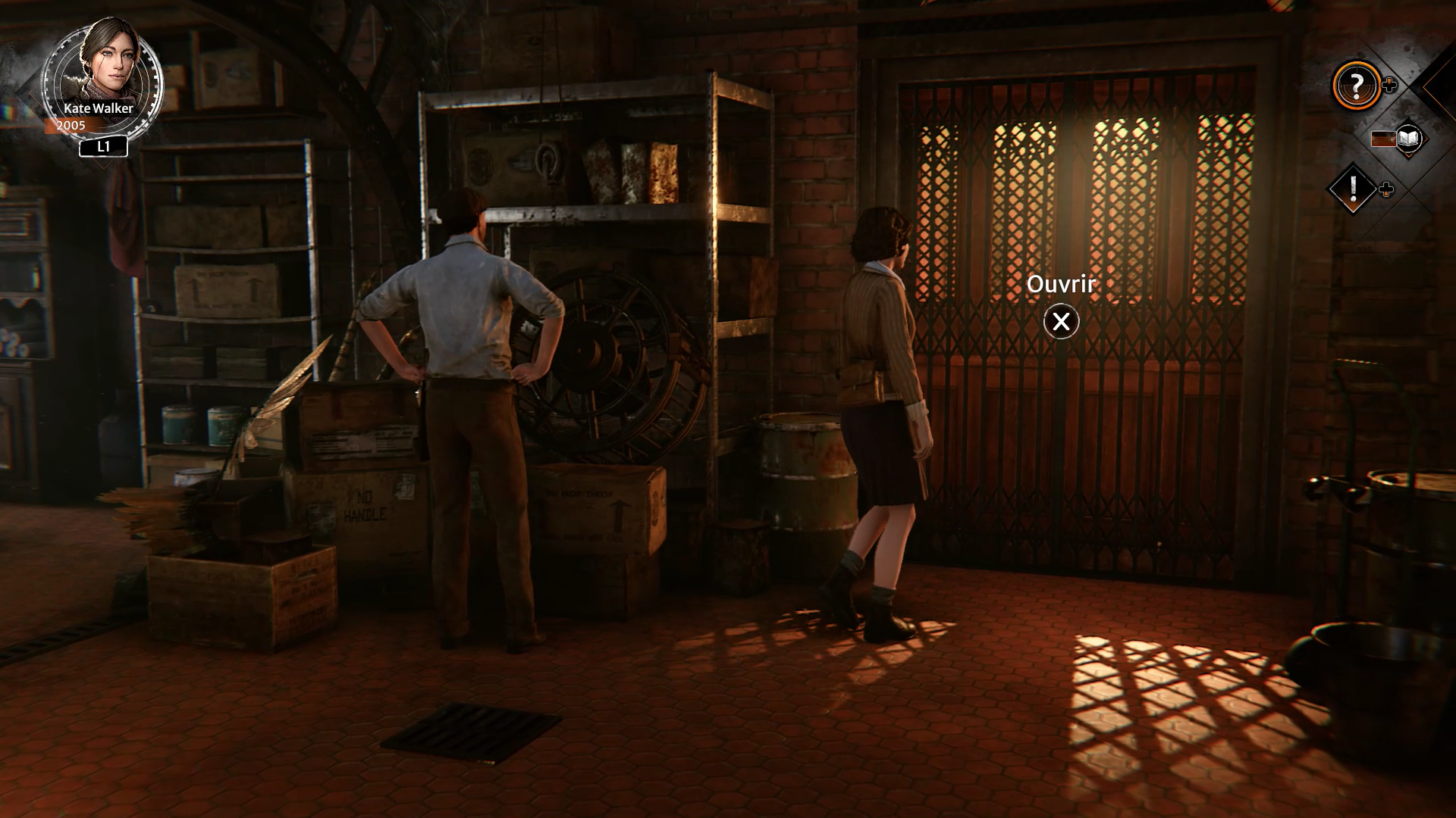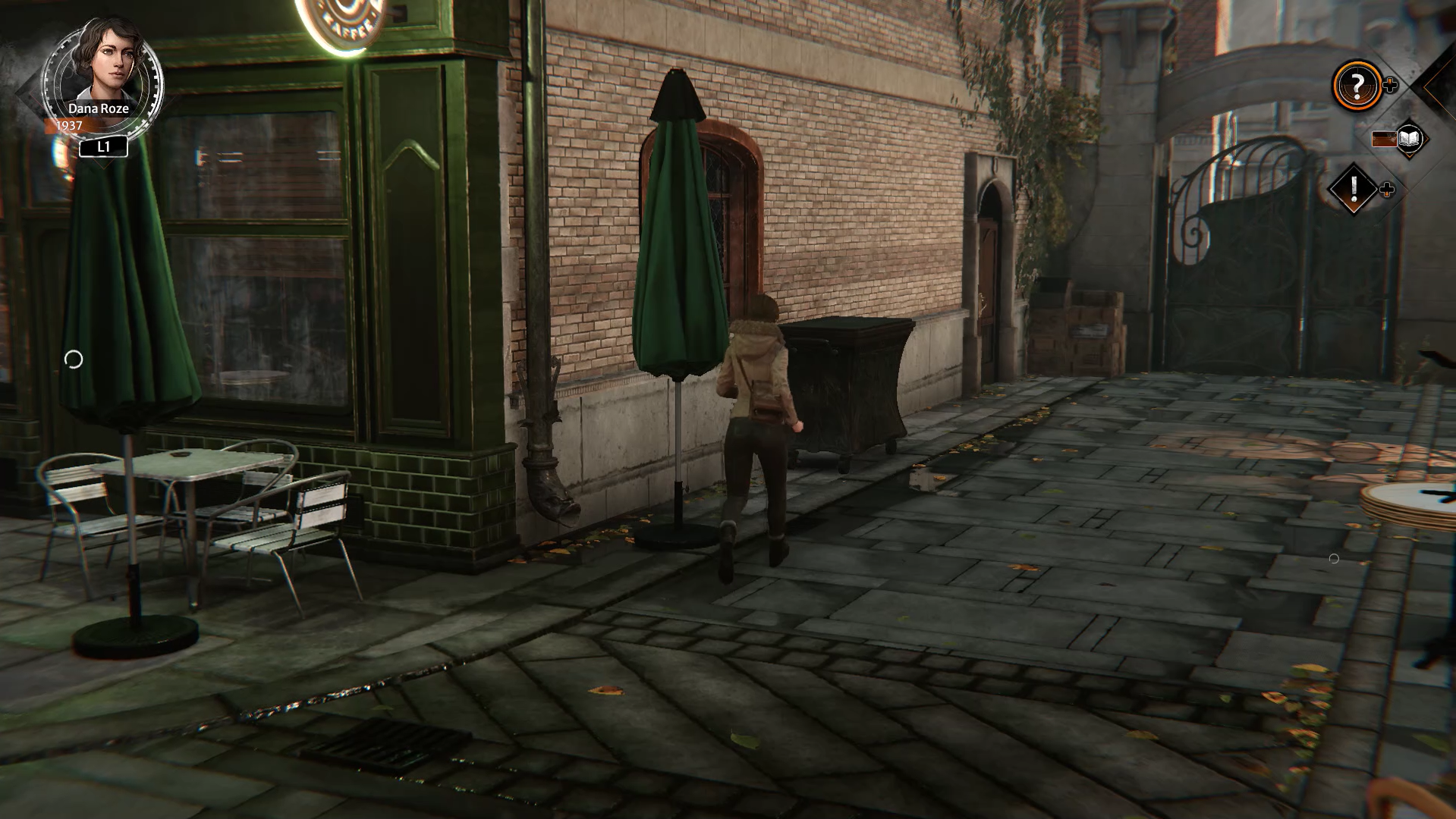Retournez avec le personnage de Kate et rendez-vous au même endroit. Le local technique est devenu un café avec une terrasse. En discutant avec le gérant, vous comprenez que vous ne pouvez pas accéder à l’ascenseur par la grande porte. Sortez du café et faites le tour du bâtiment pour trouver une porte de derrière. Une fenêtre au-dessus de la porte vous permet de rentrer dans le bâtiment. Utilisez la poubelle près de la prote et poussez-la jusqu’à la porte pour grimper dessus et vous faufilez à l’intérieur du café. Dans la salle, au niveau de l’ascenseur, se trouve une étagère. Interagissez avec pour la pousser et atteindre l’ascenseur.