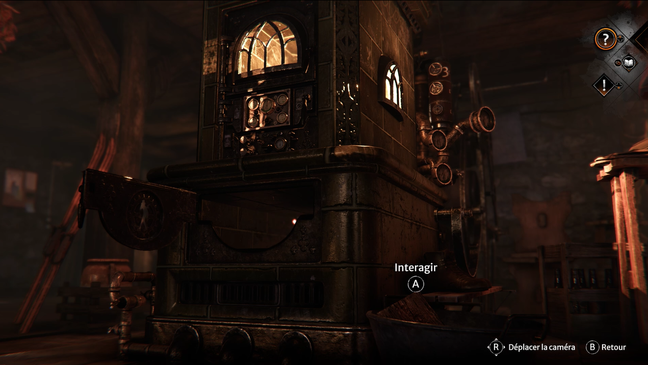 Sur la droite du poêle, vous trouvez des bottes. En dessous, se trouve une bassine avec un bout de bois. Ouvrez la trappe du poêle dans le bas de la machine et interagissez avec le bois pour l’ajouter au poêle.