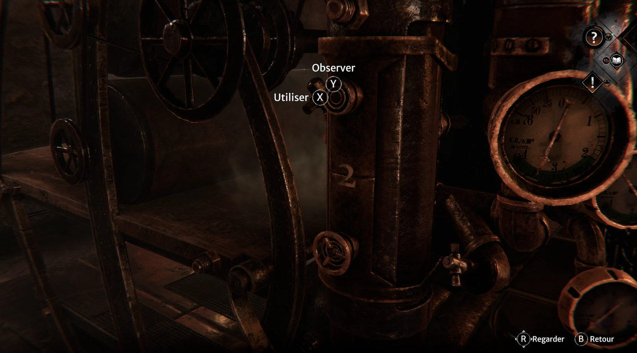 Vous devez maintenant vous occuper de la prise d’air. Sur le côté droit de la machine se trouve des valves en hauteur. Interagissez avec et retirer la valve qui est mal vissée sur le bas.