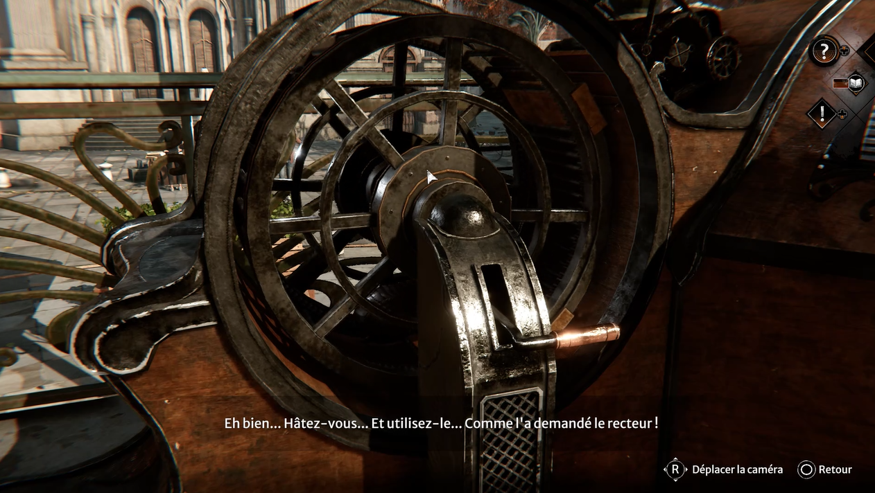 Entrez dans l’ascenseur et explorez la zone. Utilisez la manivelle près d’une échelle pour ouvrir les portes du beffroi. Près de la manivelle, sur une caisse rouge, récupérez une pièce mécanique qui vous servira par la suite. Dirigez-vous maintenant vers le moteur du mécanisme du beffroi pour le mettre en marche.