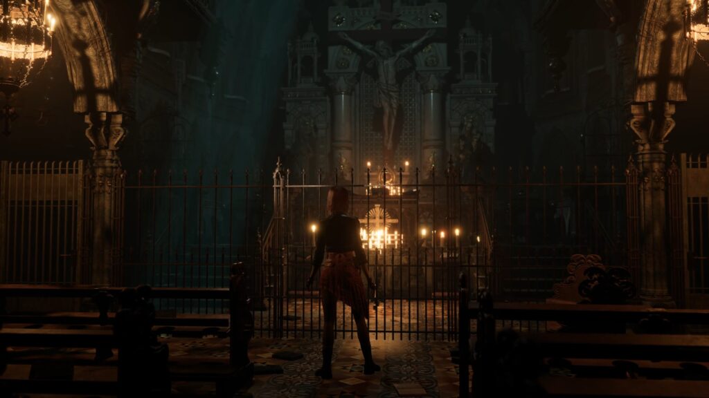 Dans le cœur de l’église, vous serez confronté à une énigme du miroir : allumez toutes les bougies sauf celle correspondant au moment où la croix est la plus lourde à porter. Référez-vous à l’image ci-dessus pour vous guider.