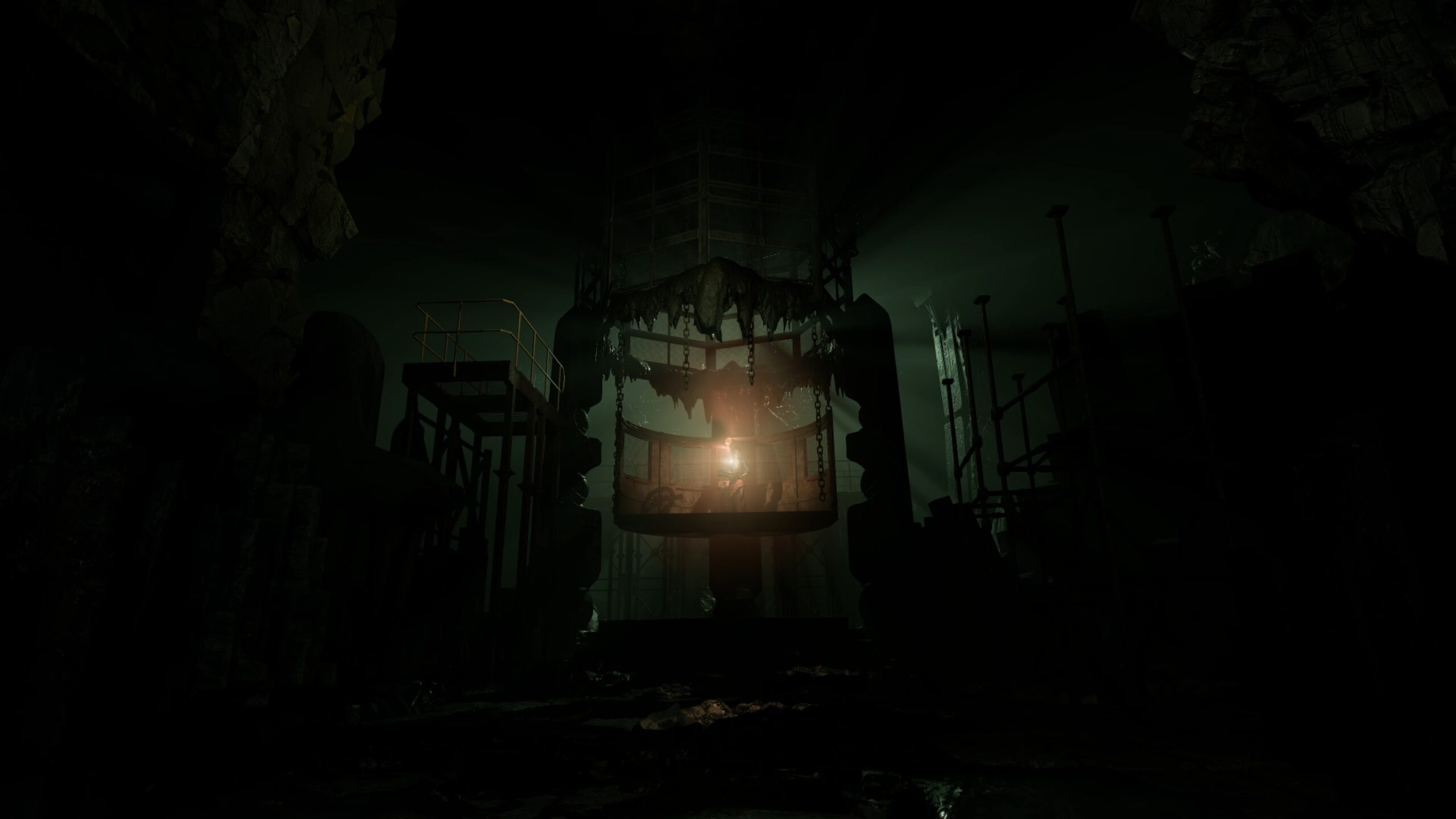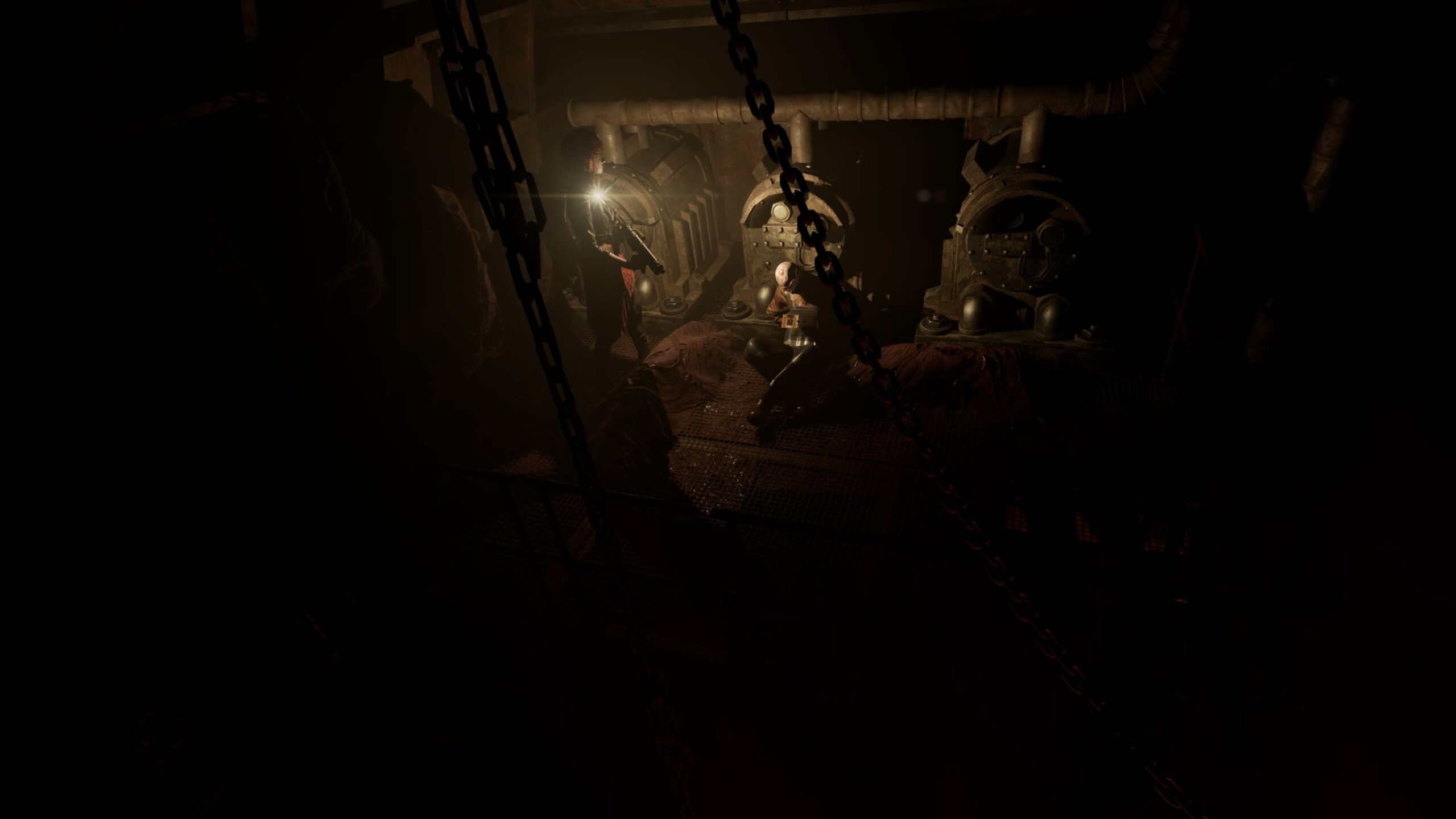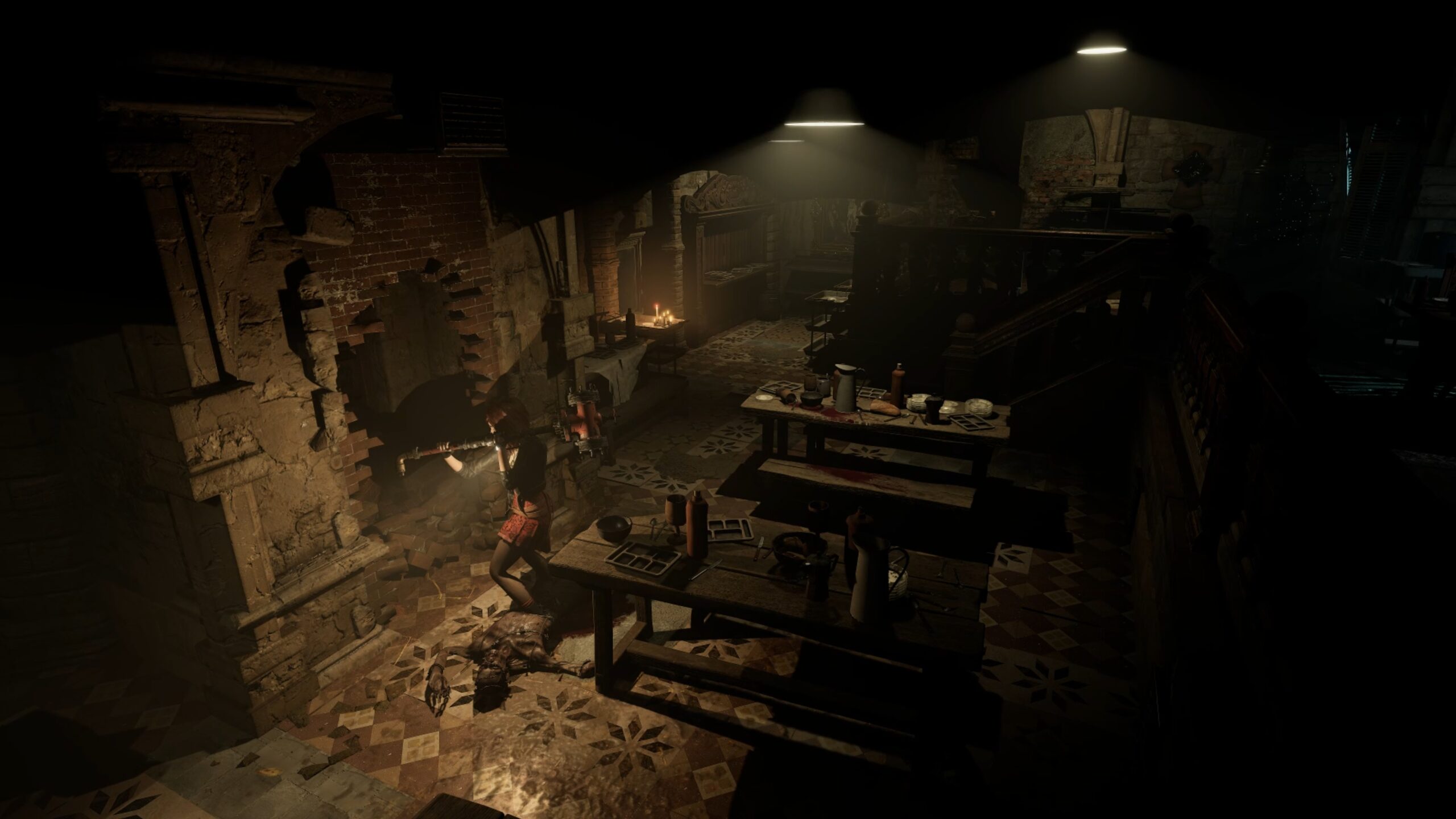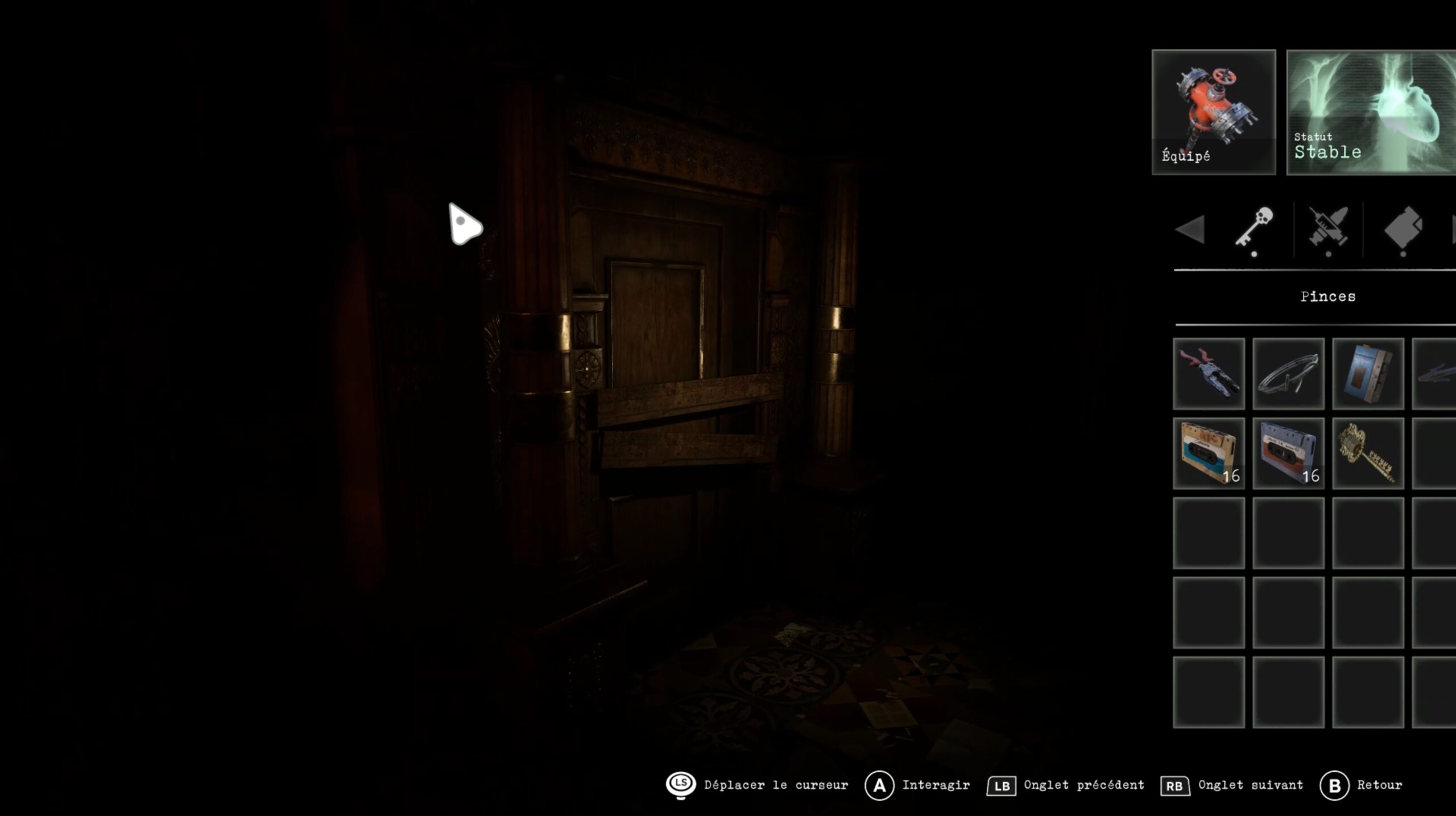 Dans l’enfoncement gauche de l’église, vous trouverez une porte : utilisez votre pied-de-biche pour retirer les planches, entrez dans la salle de la veillée et franchissez la porte au fond, fouillez la réserve pour récupérer un tuyau dans le casier du fond, retournez ensuite dans la salle principale pour trouver un ascenseur, déposez le tuyau à l’intérieur puis fixez-le avec du fil de fer à l’aide des pinces.