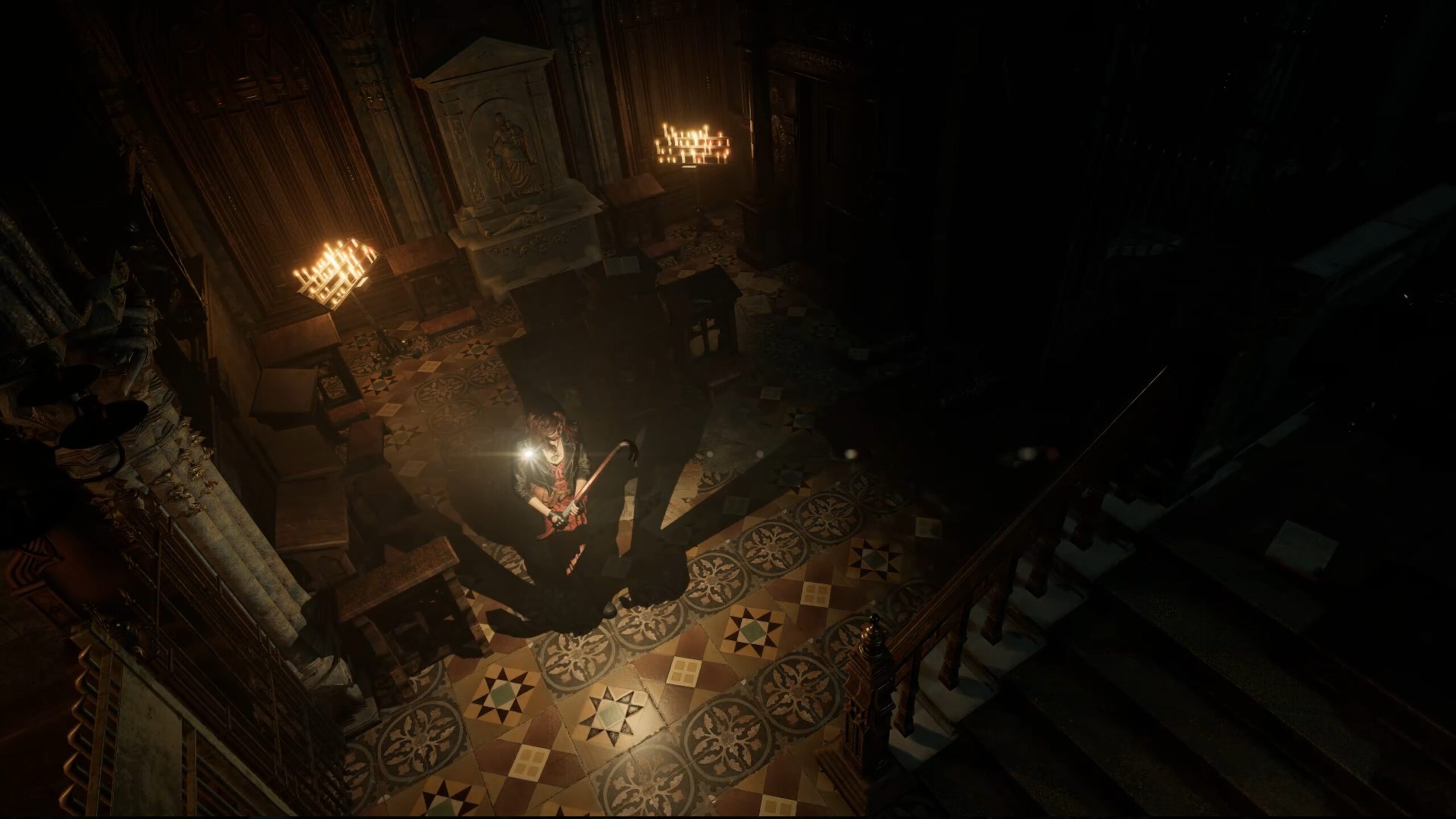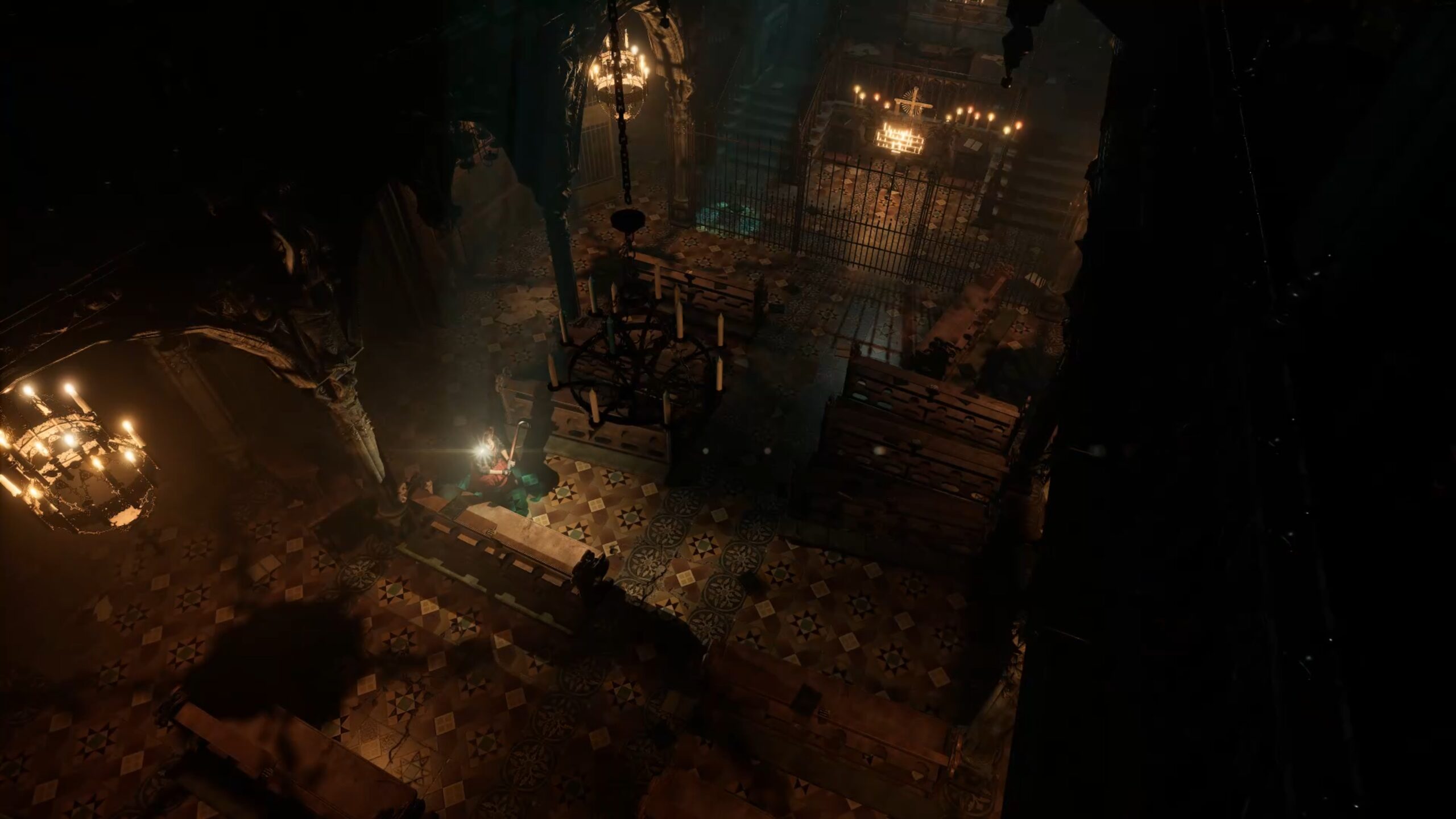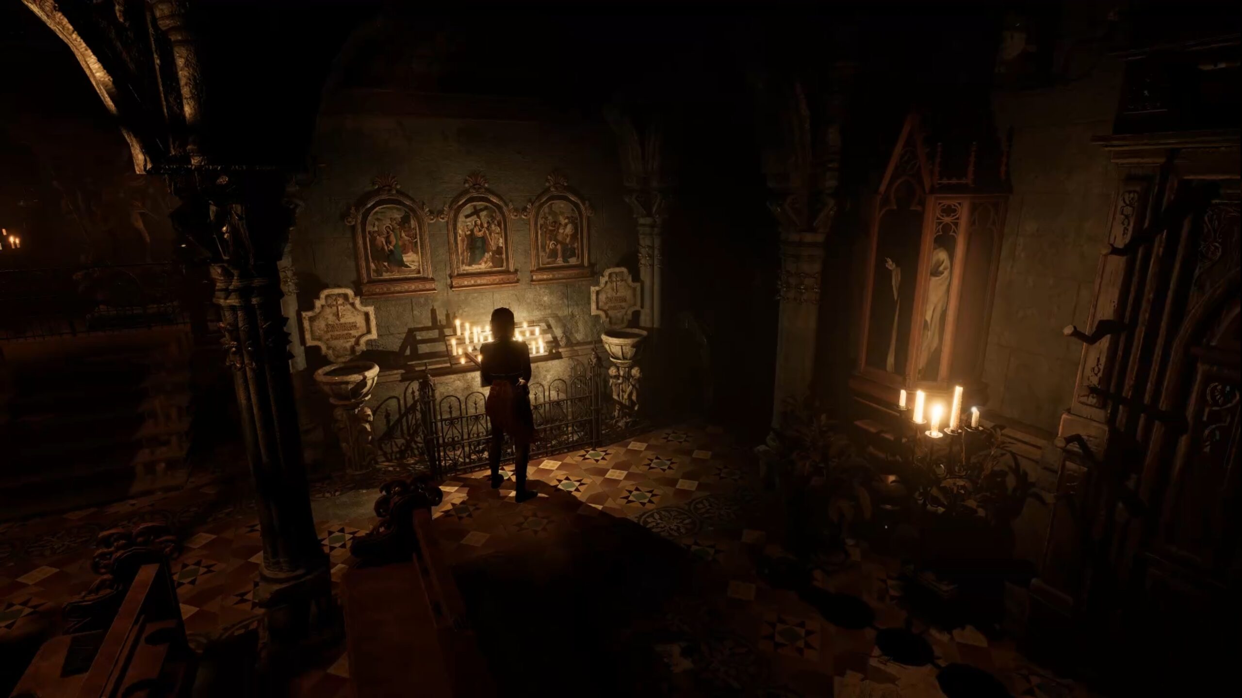 Dans le cœur de l’église, vous serez confronté à une énigme du miroir : allumez toutes les bougies sauf celle correspondant au moment où la croix est la plus lourde à porter. Référez-vous à l’image ci-dessus pour vous guider.