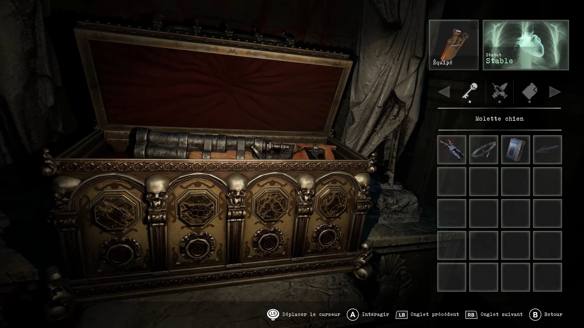 Allez ensuite au sud pour entrer dans un caveau et trouver un coffre où placer les molettes. Disposez-les comme indiqué sur notre image ci-dessus : l’aigle incliné, la tortue sur le dos, la chauve-souris sur le dos et le chien sur deux pattes. Vous obtiendrez alors un canon à main.