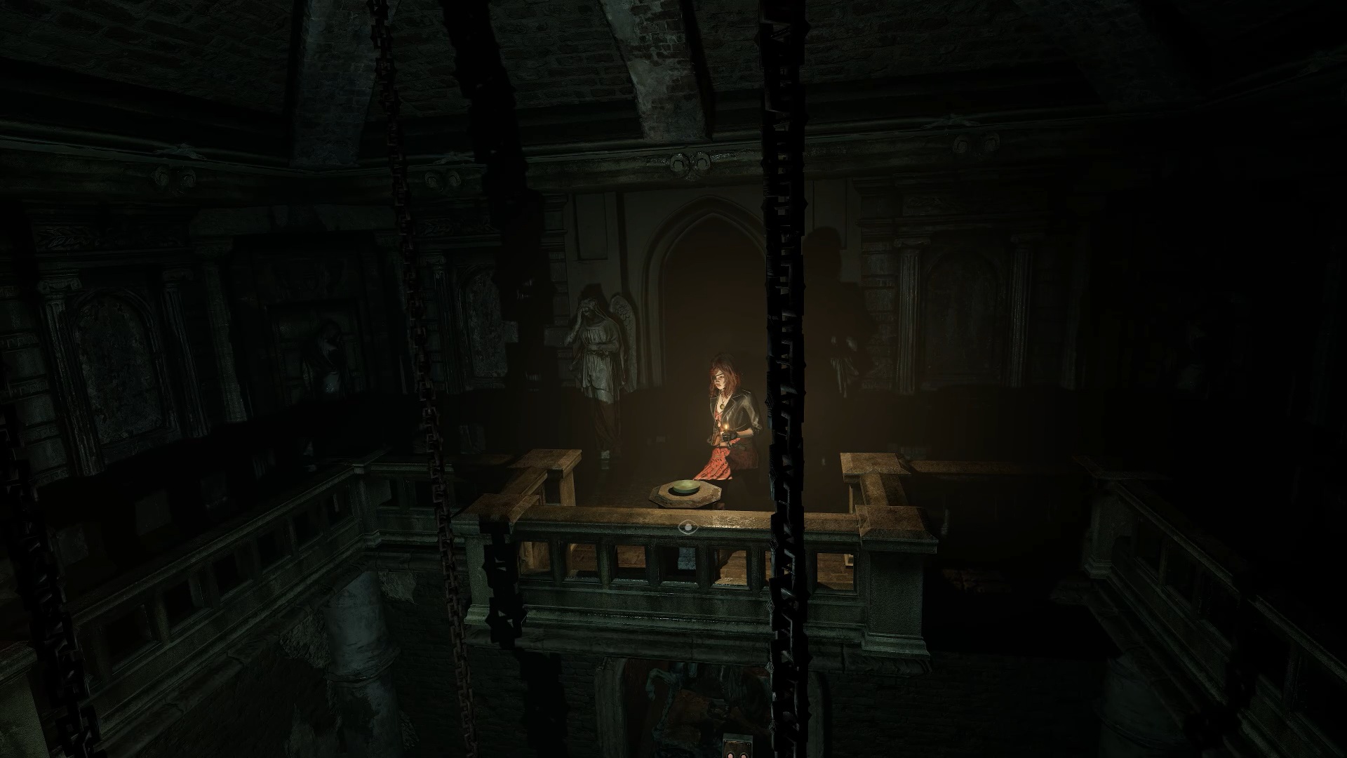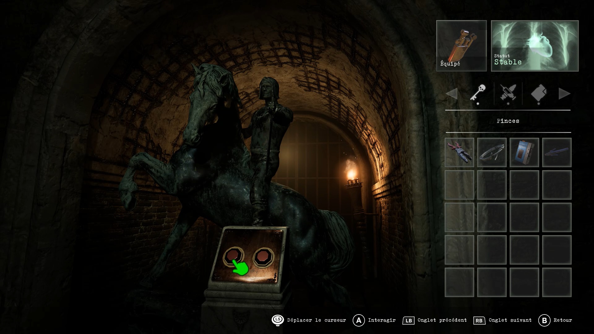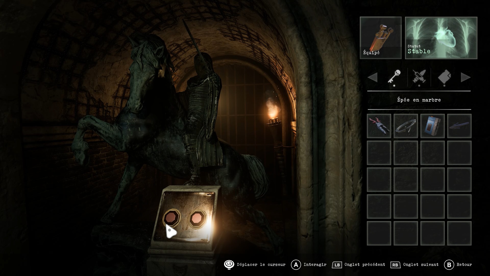 Dans la chambre, descendez par l’échelle pour rejoindre la salle des statues. Placez l’épée sur le cavalier de la Mort et orientez son arme sur 2 h. Tournez ensuite le cavalier de la Famine sur 3 h, le cavalier Roi sur 12 h, et enfin le cavalier de la Guerre sur 6 h.