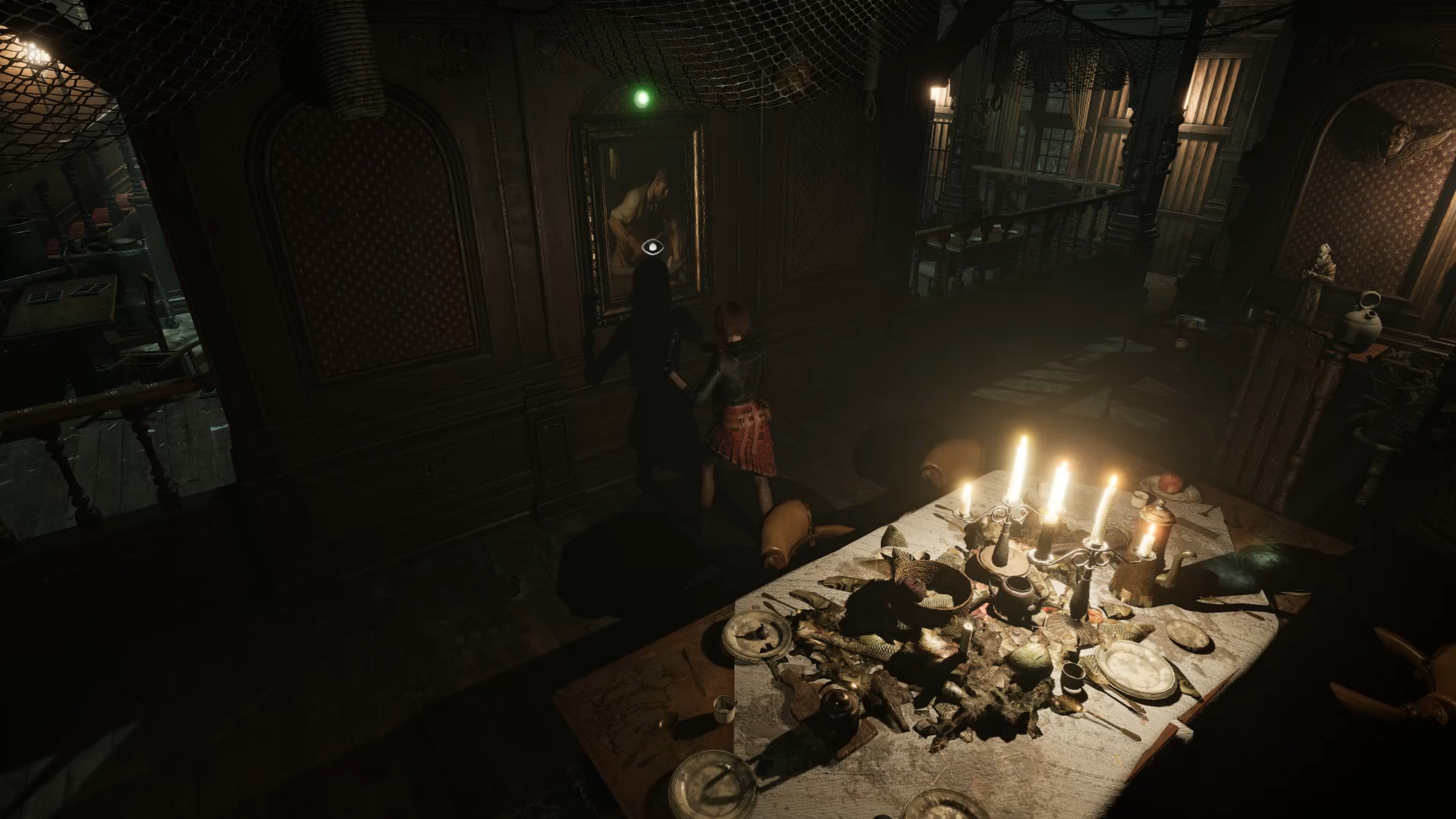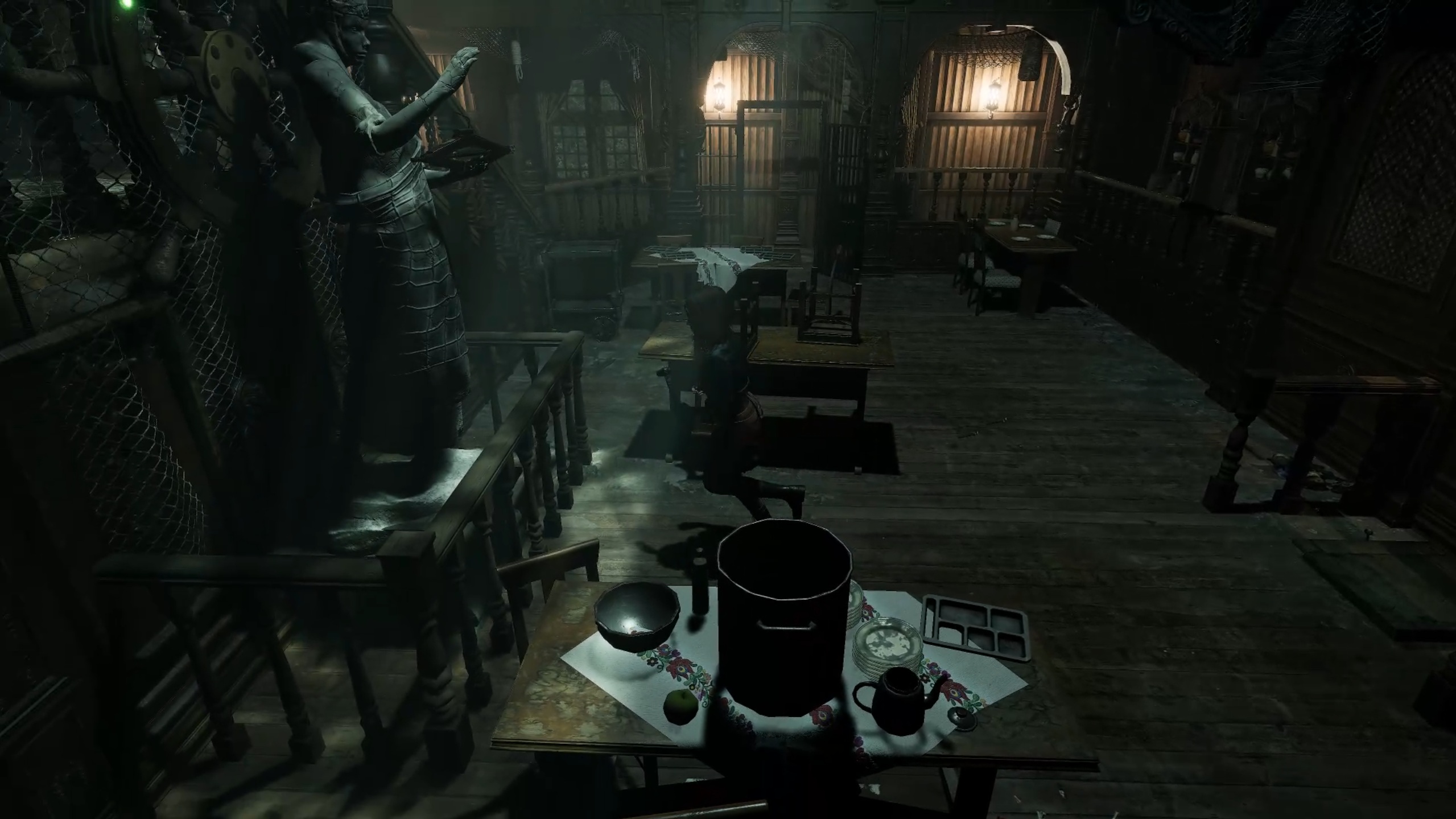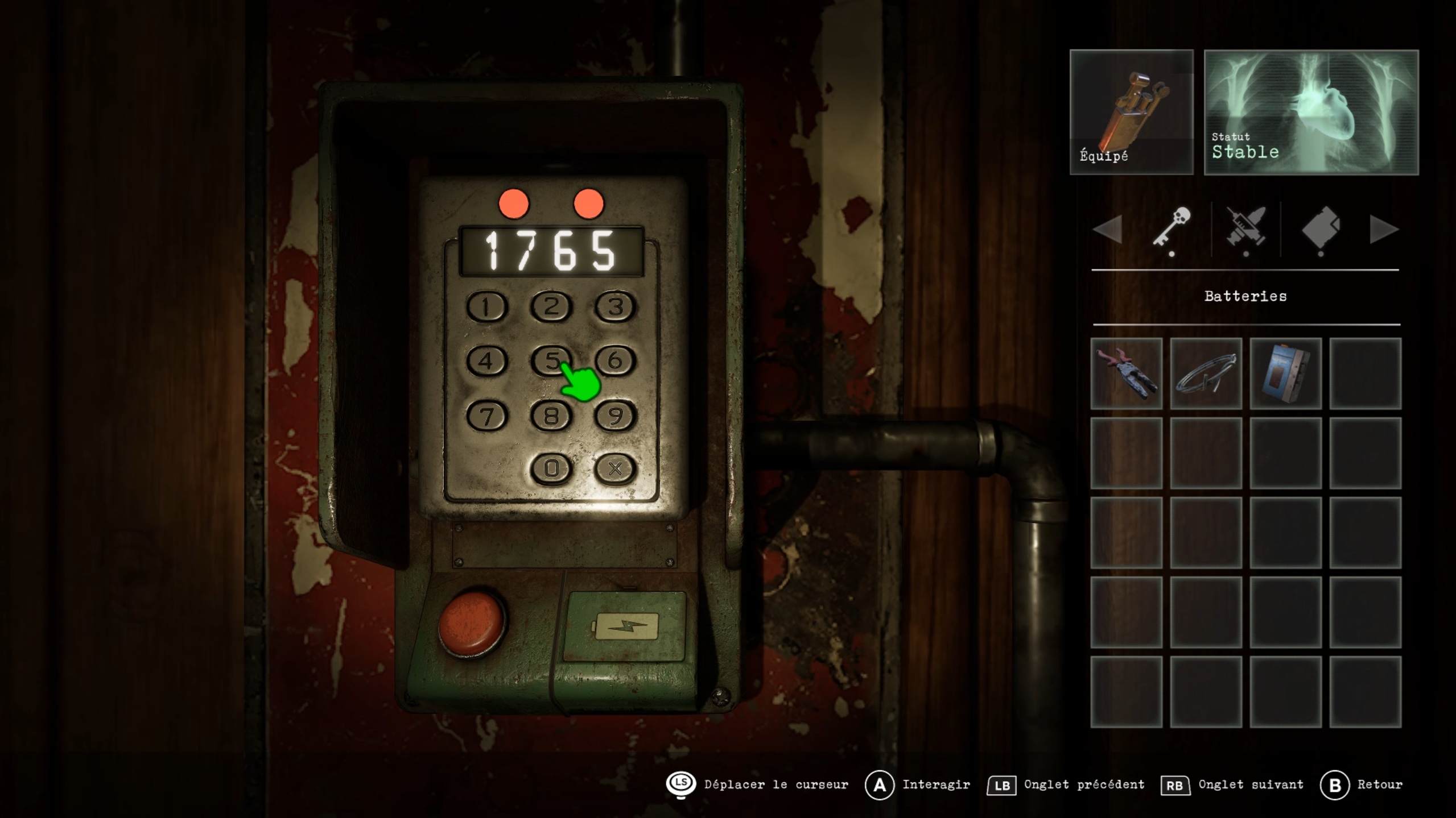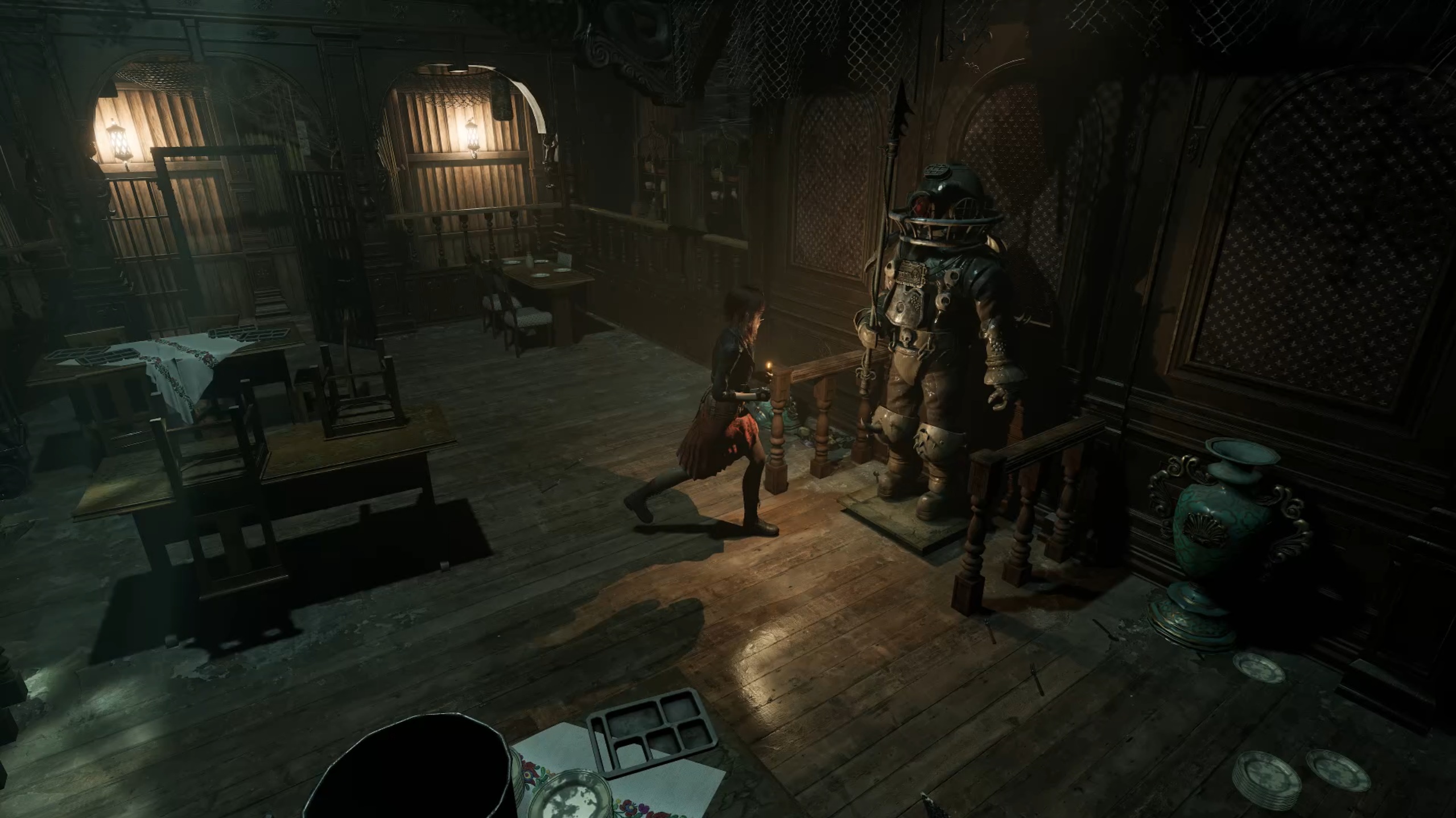 Rejoignez désormais l’aile supérieure pour aller au fond du couloir et insérer les batteries dans le digicode. Utilisez le code 1765, issu de l’indice trouvé dans la réserve, pour entrer dans la salle à manger. Descendez ensuite au rez-de-chaussée et interagissez avec la statue portant un scaphandre afin de récupérer une plaque à œil. Un combat se déclenche alors : éliminez la menace pour vous libérer, puis rendez-vous dans les cuisines.