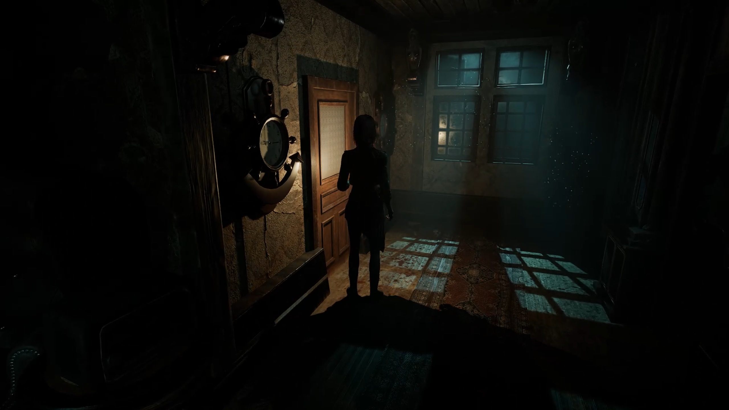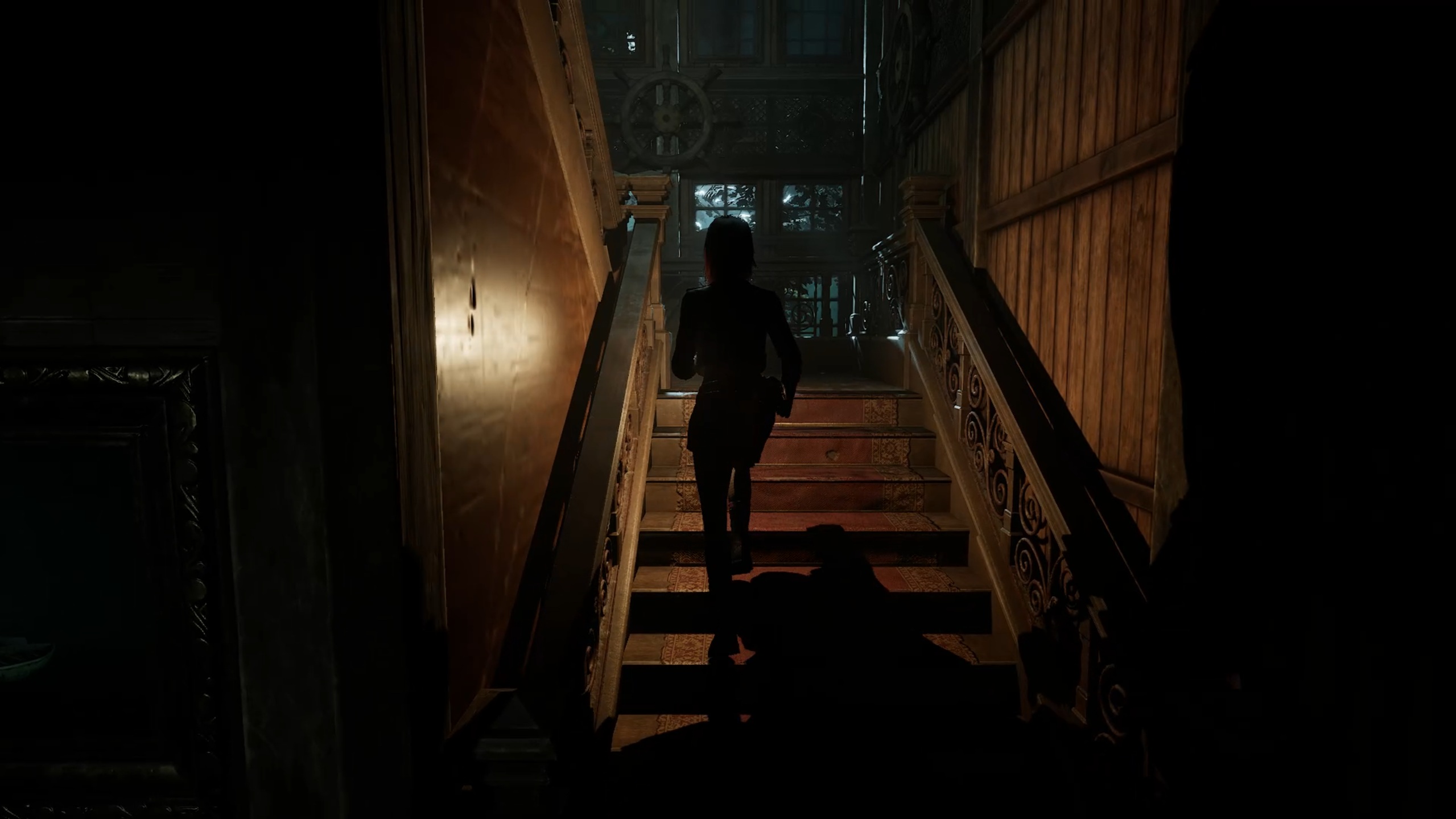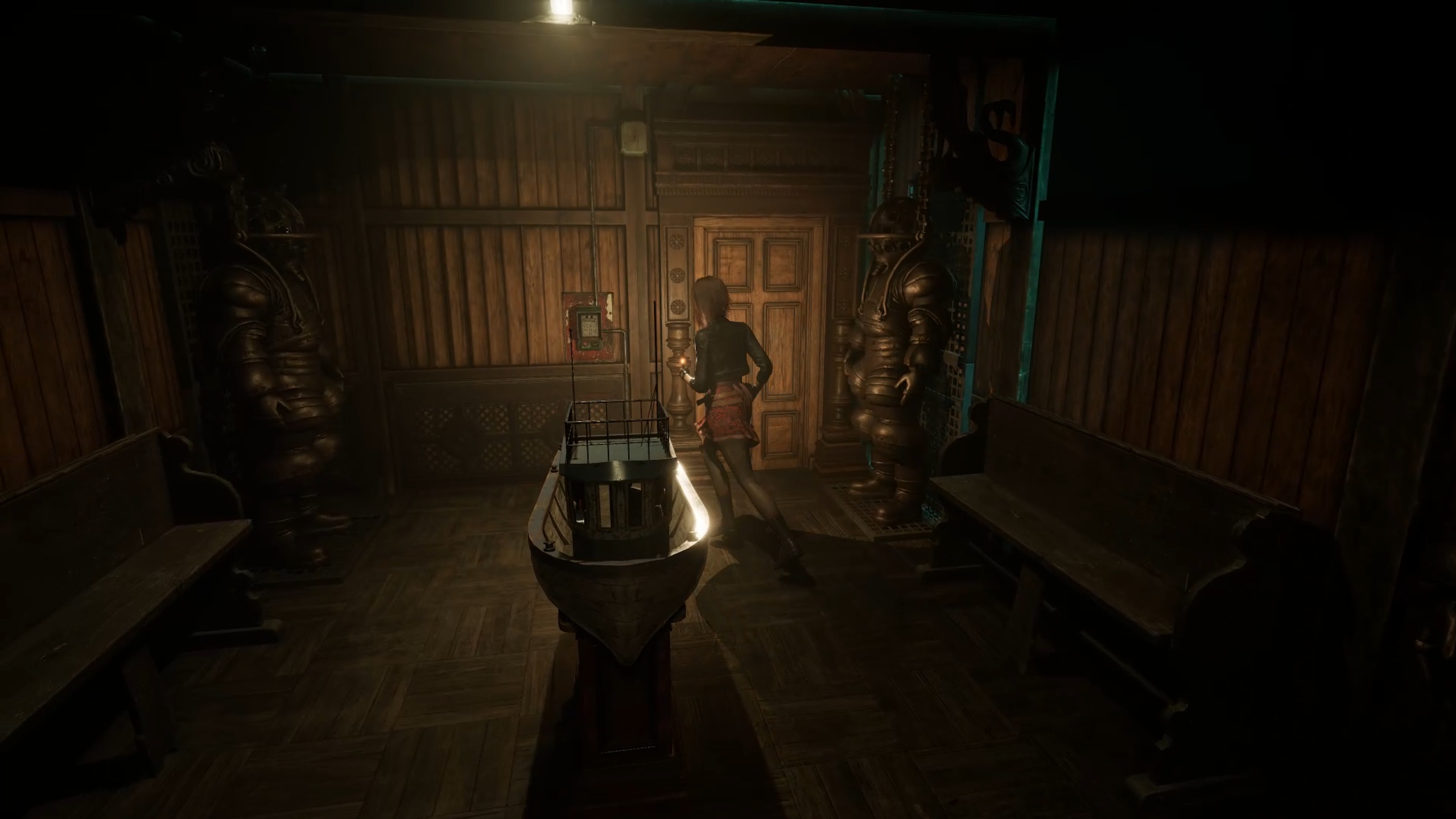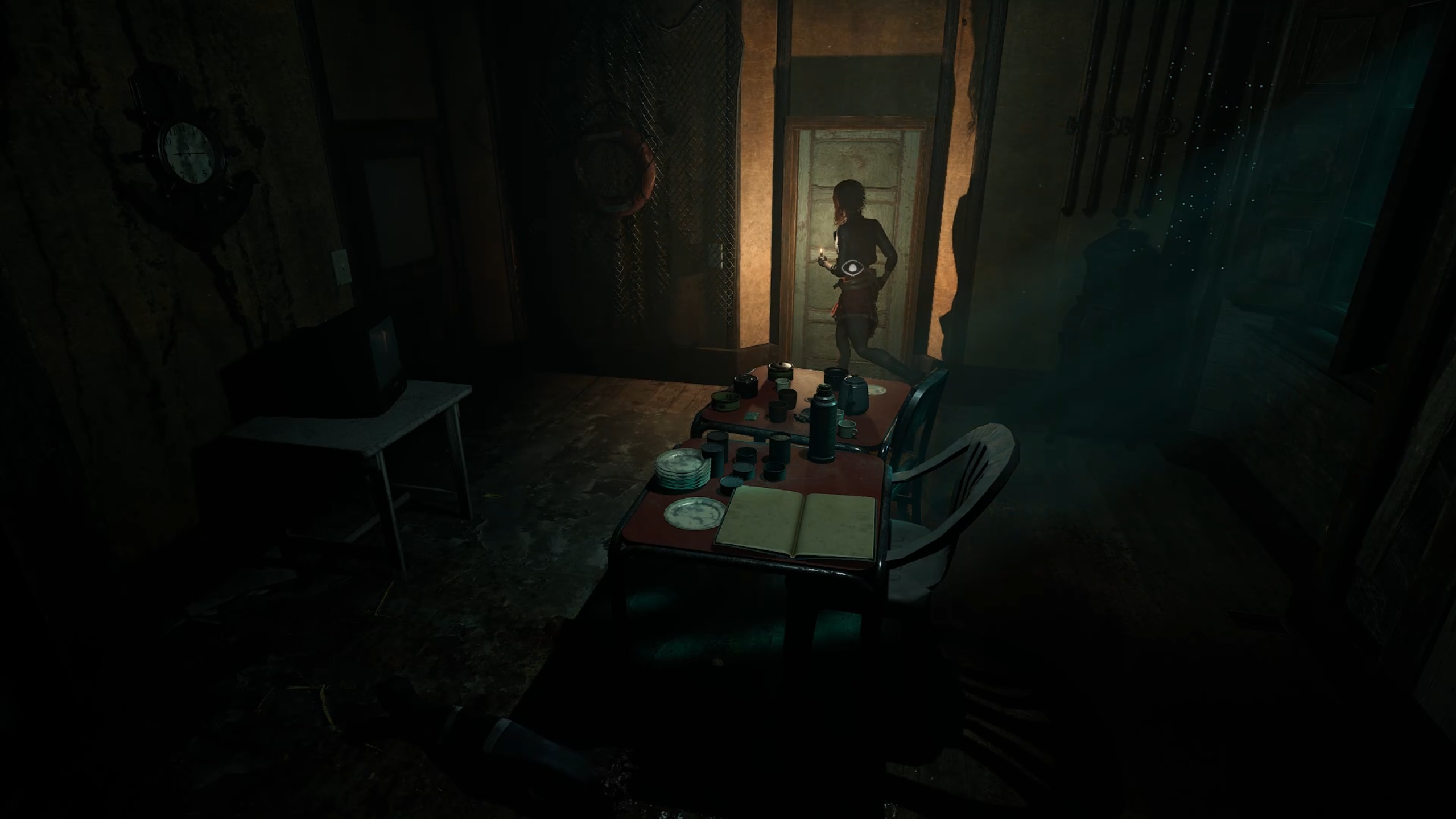 Rejoignez désormais l’aile supérieure pour aller au fond du couloir et insérer les batteries dans le digicode. Utilisez le code 1765, issu de l’indice trouvé dans la réserve, pour entrer dans la salle à manger. Descendez ensuite au rez-de-chaussée et interagissez avec la statue portant un scaphandre afin de récupérer une plaque à œil. Un combat se déclenche alors : éliminez la menace pour vous libérer, puis rendez-vous dans les cuisines.