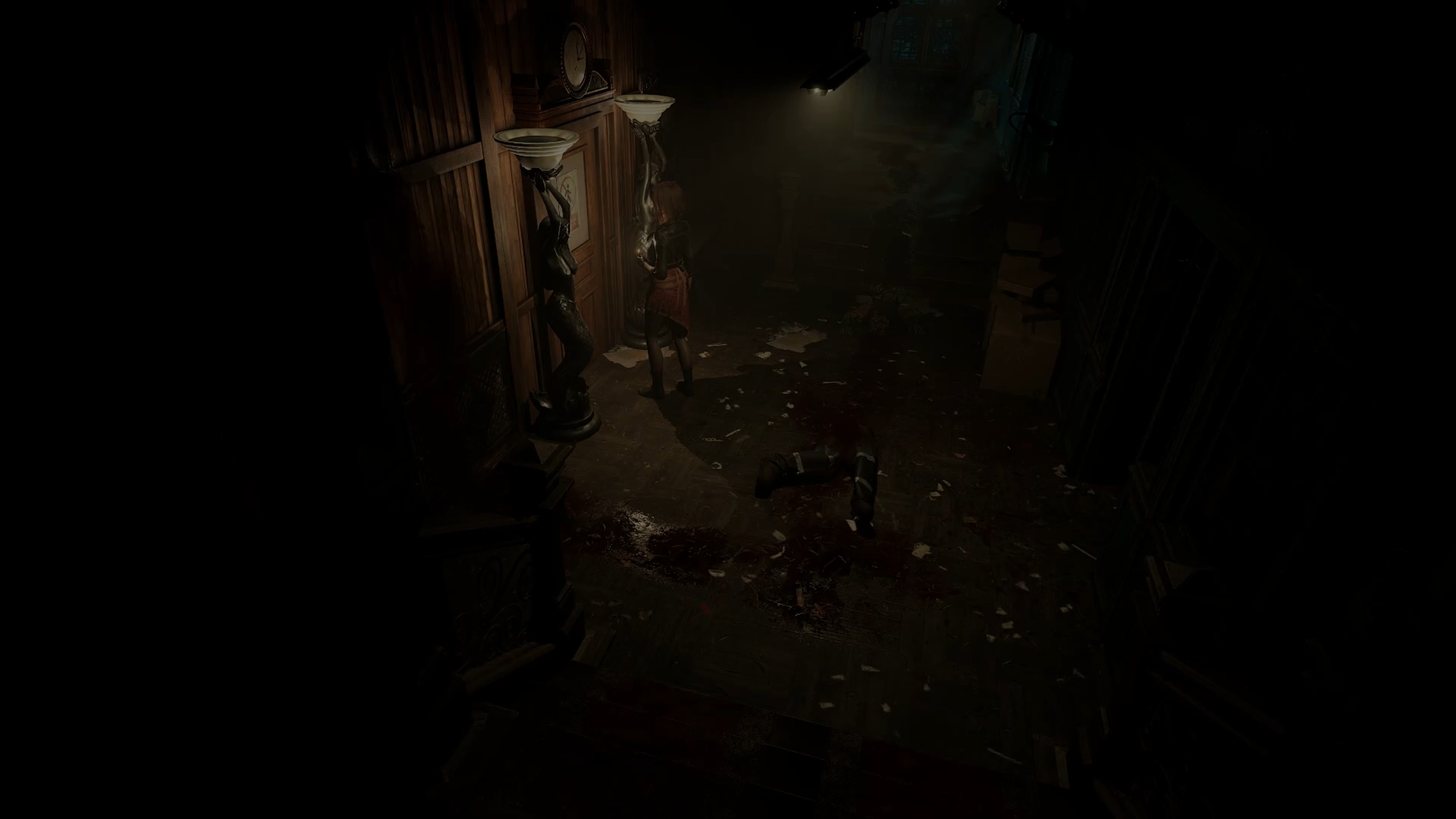 Récupérez la plaque en métal dans les cendres, puis revenez à la salle à manger en prenant l’ascenseur. En chemin, vous trouverez une amélioration pour le fusil à pompe. Rejoignez ensuite les bureaux, examinez un corps posé sur un bureau pour récupérer un socle en métal, puis combinez le socle avec la plaque pour obtenir une nouvelle clé.
