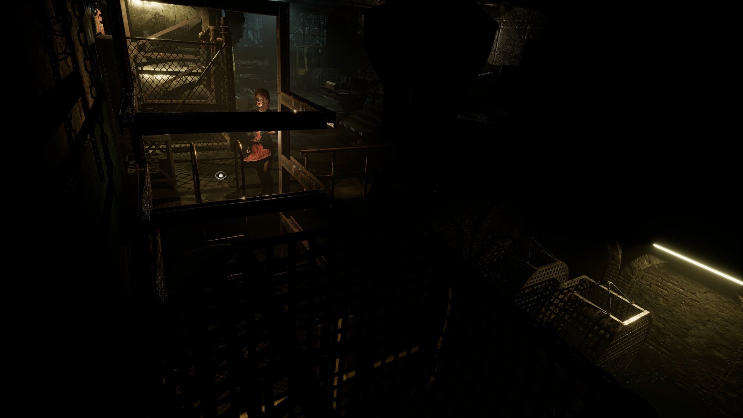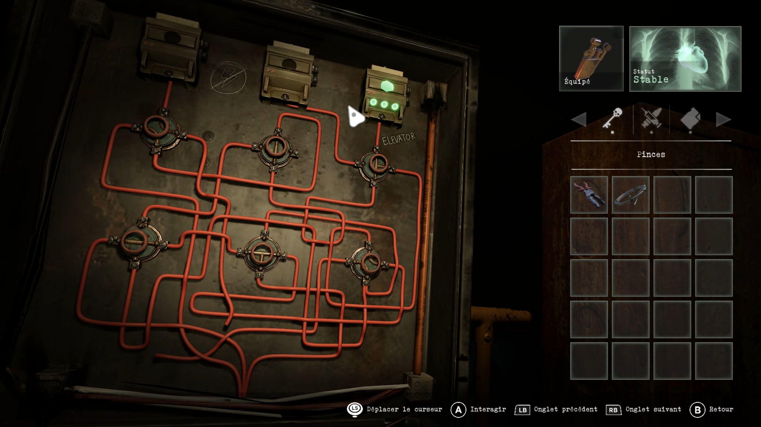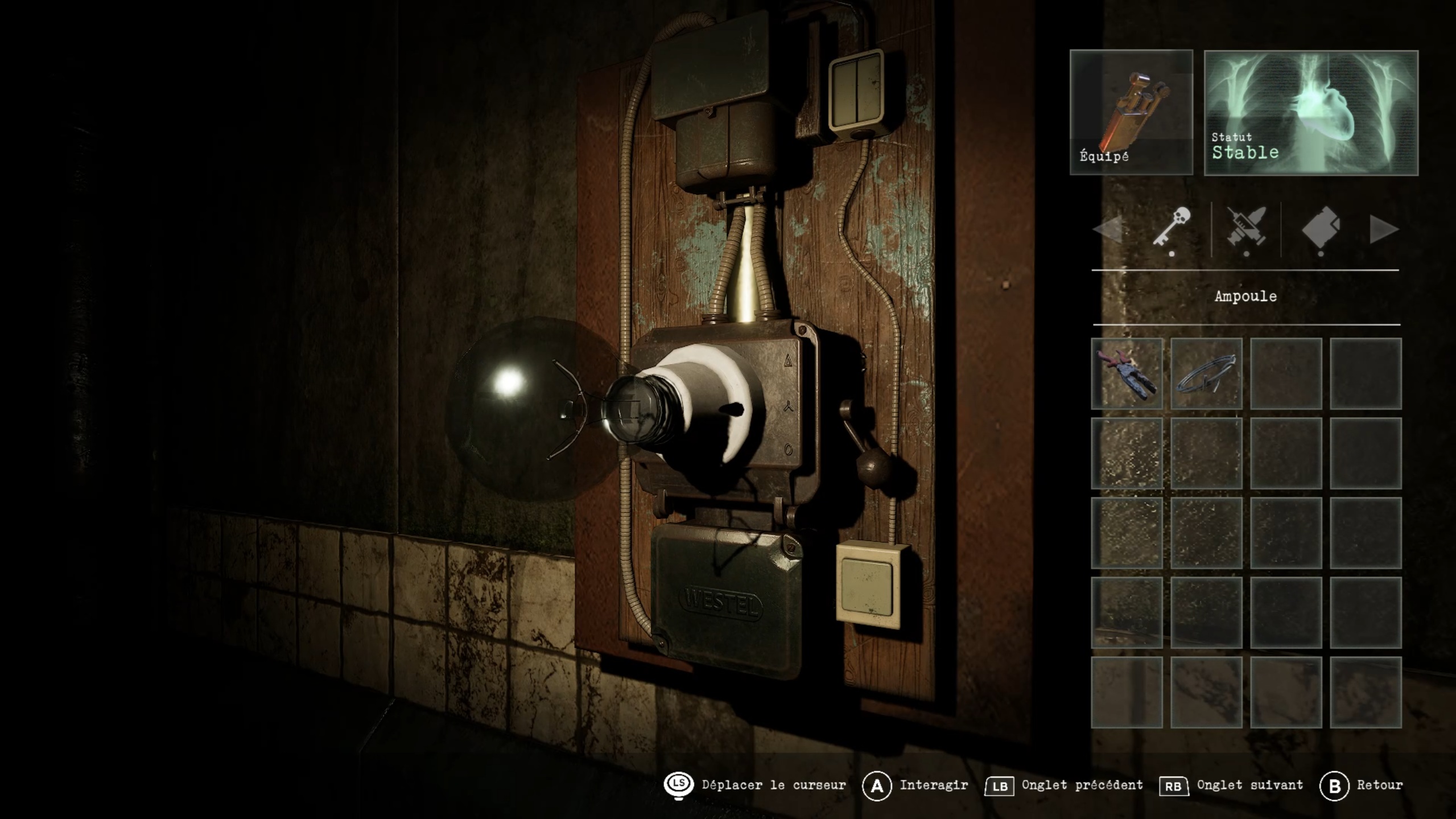 Dans la cellule, récupérez l’ampoule, puis utilisez la cloueuse contre la porte pour tirer sur l’interrupteur et vous libérer. Dirigez-vous ensuite vers l’autre extrémité du couloir du sous-sol pour insérer l’ampoule dans une douille. Enfin, utilisez le pied-de-biche pour détruire les caisses et empruntez le nouvel ascenseur.