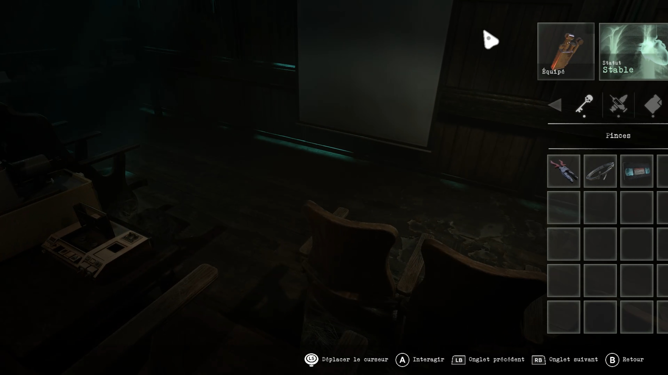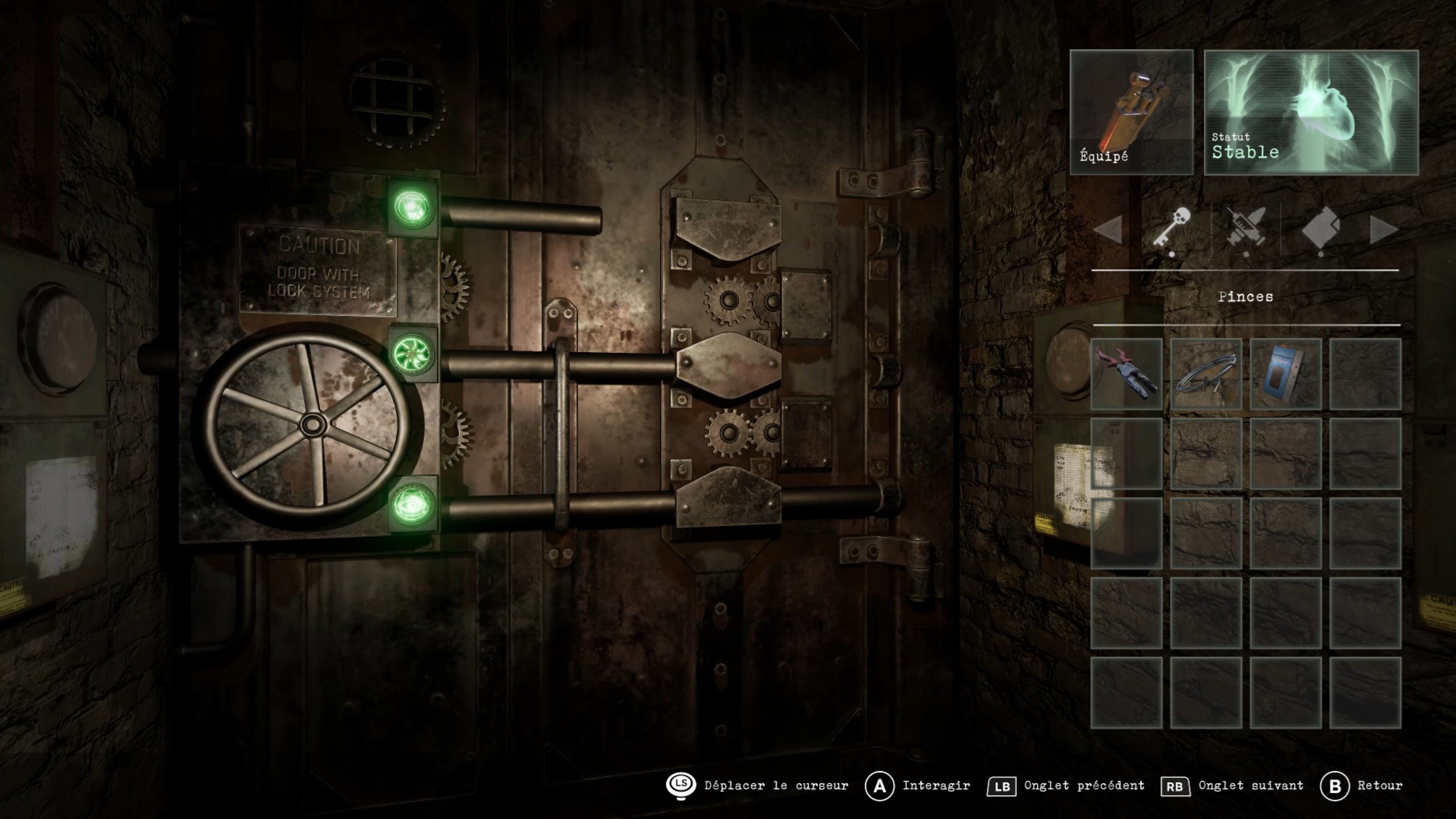 Revenez ensuite dans le couloir de l’aile supérieure pour déclencher une cinématique. Poursuivez dans le couloir afin de rejoindre le dortoir et franchissez une porte. Vous y retrouverez l’homme en chaise roulante. Récupérez le pied-de-biche à proximité et équipez-vous-en comme arme.